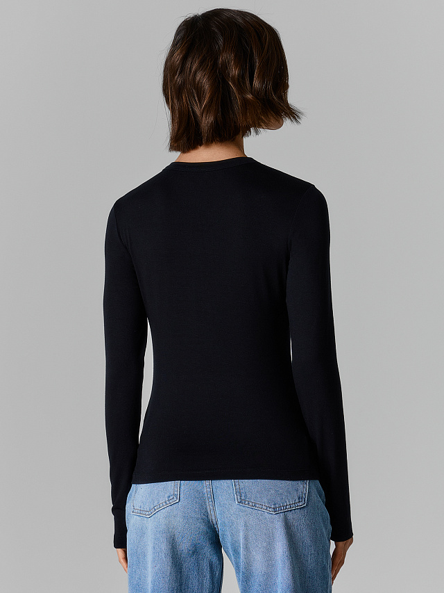 Черный джемпер прилегающего кроя — элегантная и удобная вещь, которая мягко облегает фигуру, подчёркивая естественные линии. Узкий длинный рукав и аккуратная круглая горловина делают силуэт стройным и собранным, при этом модель остаётся комфортной для повседневной носки.