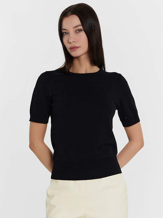 Этот женский джемпер с короткими рукавами и круглым вырезом станет прекрасным дополнением вашего гардероба. Приталенный крой подчеркнёт вашу фигуру, а декоративные бусины добавят милый и элегантный акцент. Изделие выполнено из вискозы с добавлением искусственных волокон, что обеспечивает прочность и долговечность. Джемпер идеально подходит для создания стильных и уютных образов, которые можно легко комбинировать с брюками, джинсами или юбками. Отличный выбор для любого сезона!