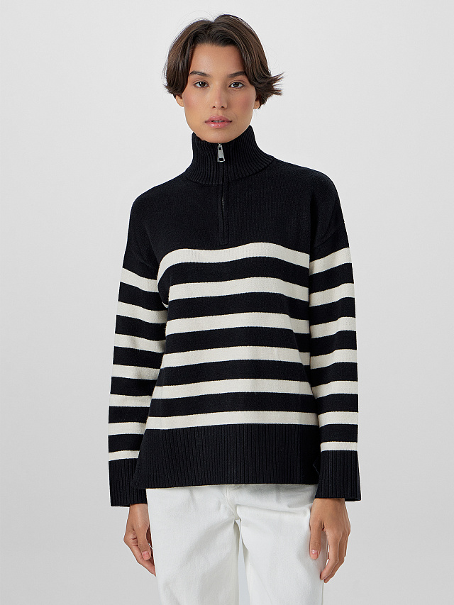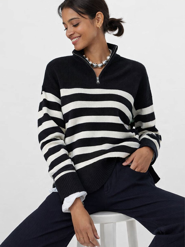 Женский вязаный джемпер черного цвета в белую полоску — элегантная модель с практичной деталью. Удобная молния, которая расстегивается от середины груди до верха воротника, позволяет регулировать степень открытости и создавать многослойные образы. Модель выполнена из комбинированной пряжи: вискоза дарит нежность и мягкость, нейлон обеспечивает износостойкость и сохранение формы, а полиэстер добавляет практичности и упругости.