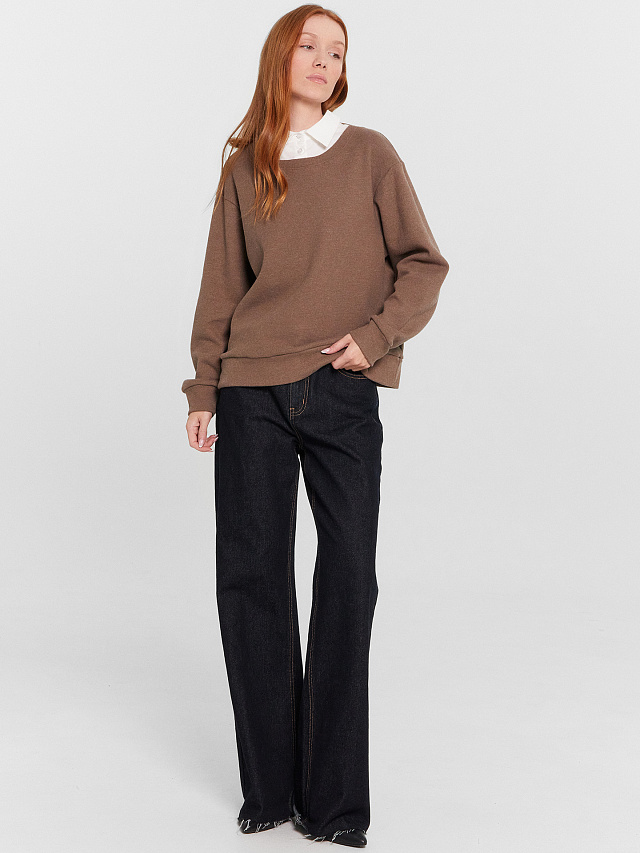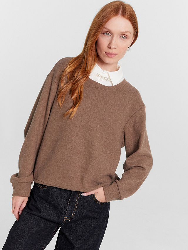 Женский джемпер свободного кроя выполнен из нежного материала селаник, который славится своей мягкостью и теплотой. Этот материал также отличается высокой износостойкостью и легкостью в уходе, что делает его идеальным выбором для повседневной одежды. Горловина круглой формы с воротником, имитирующим рубашку, и застежкой на пуговицу придает джемперу оригинальный и стильный вид. Длинные рукава со спущенной линией плеча и манжетами обеспечивают свободу движений и добавляют образу расслабленности и комфорта.