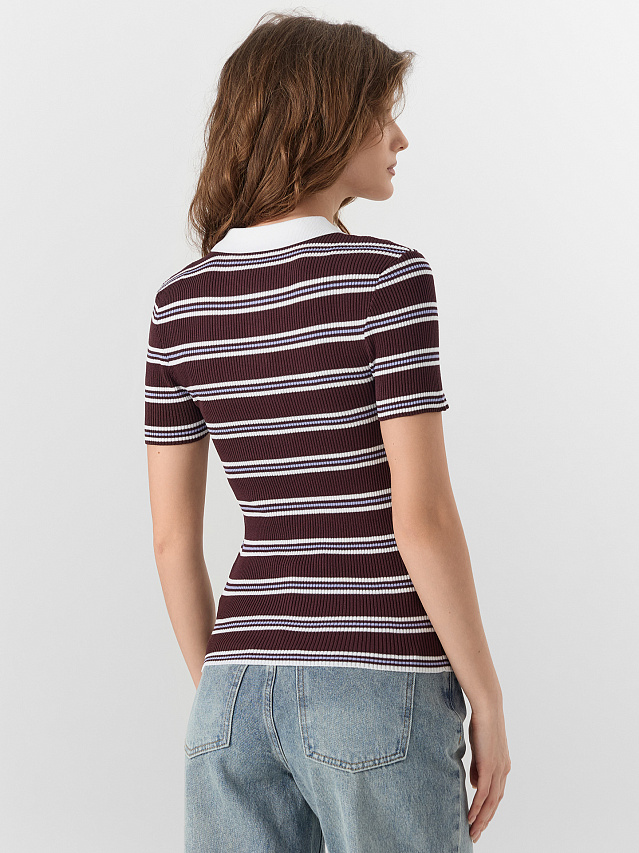Коричневый женский джемпер в полоску с короткими рукавами и воротником-поло, выполненный из мягкой трикотажной рибаны, представляет собой универсальную модель для повседневной носки, которая сочетает в себе элегантность, удобство и лаконичный стиль. Приталенный джемпер, изготовленный из вискозы с добавлением полиэстера, мягко облегает фигуру, подчеркивая силуэт и создавая аккуратный, женственный образ, подходящий для самых разных ситуаций.