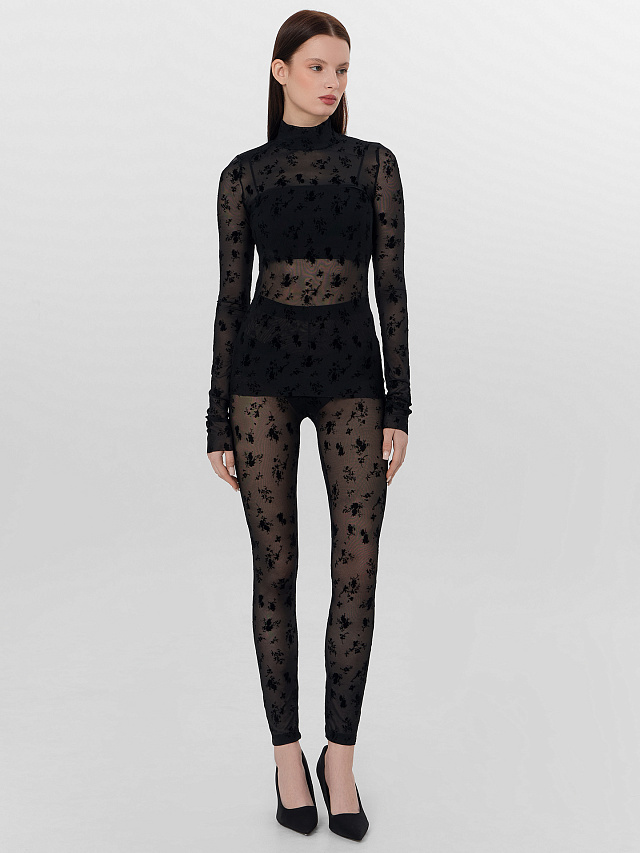 Черный джемпер с цветочным принтом создает стильный и актуальный образ. Прилегающий силуэт из трикотажа с фактурой сетки мягко подчеркивает линии фигуры, создавая эффектную и женственную посадку.