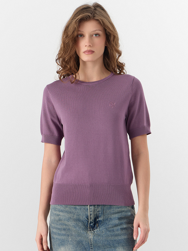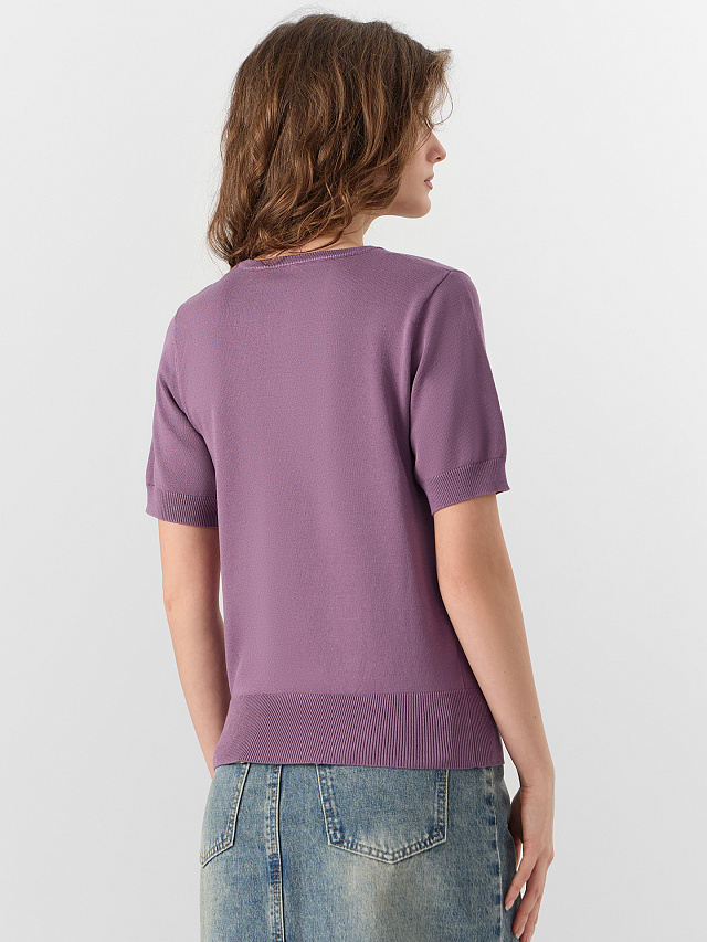Фиолетовый женский джемпер с короткими рукавами и круглой горловиной — это лаконичная модель для повседневной носки. Он выполнен из мягкого трикотажа на основе вискозы, который хорошо драпируется, приятно ощущается на коже и сохраняет форму.