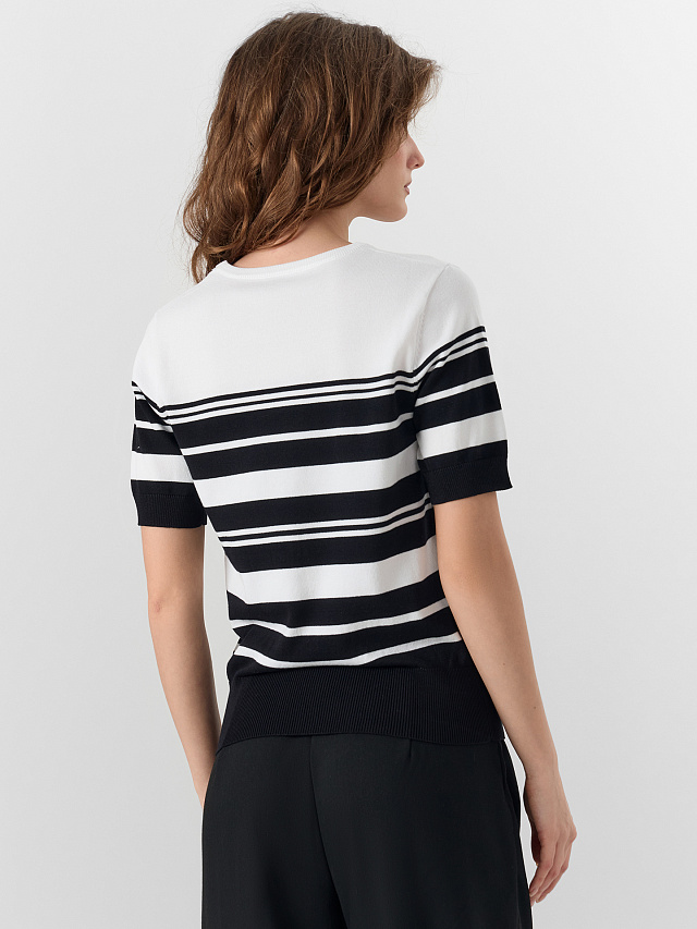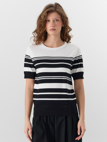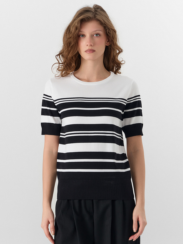 Женский джемпер в черно-белую полоску с короткими рукавами и круглой горловиной — это лаконичная модель для повседневной носки. Он выполнен из мягкого трикотажа на основе вискозы, который хорошо драпируется, приятно ощущается на коже и сохраняет форму.