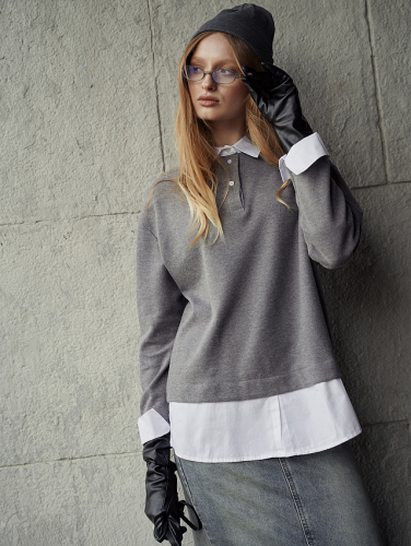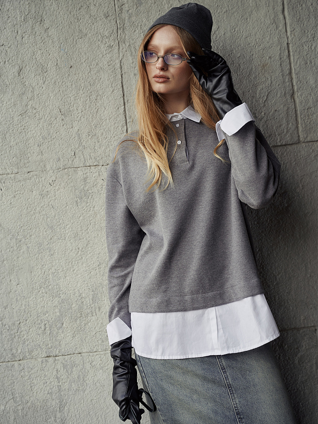 Джемпер сочетает практичность и стиль: имитация рубашки создает иллюзию многослойности, добавляя образу сложность и глубину. Плотный трикотаж на основе хлопка с добавлением полиэстера отлично держит форму, не сминается и сохраняет комфорт в течение всего дня.