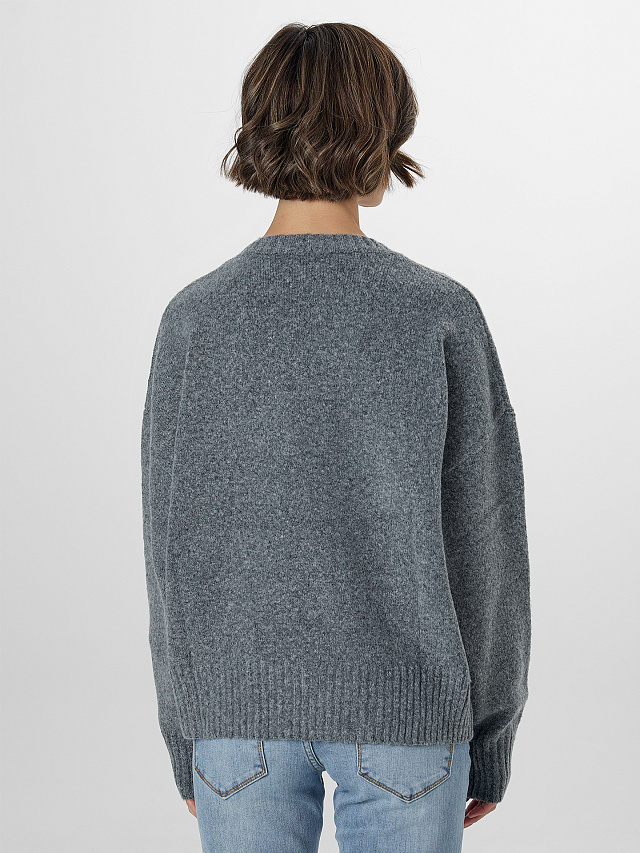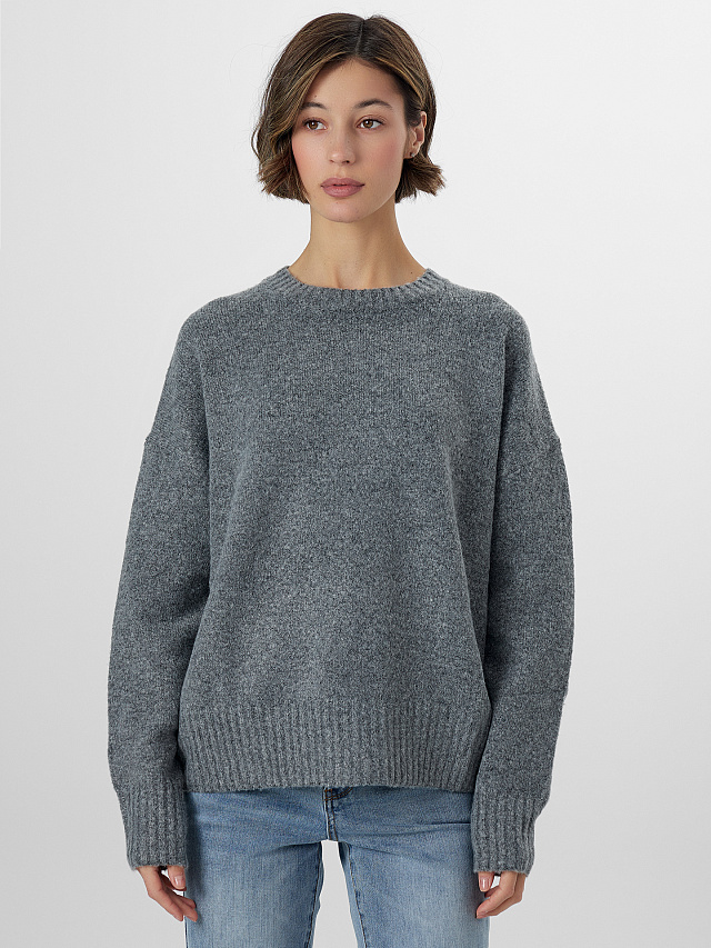 Серый женский джемпер, созданный из мягкого вязаного трикотажа с добавлением шерсти, станет источником уюта и тепла в прохладную погоду. Модель прямого силуэта обеспечивает комфортную свободу движений, позволяя легко сочетать его с различными элементами гардероба — джинсами, юбками или брюками. Длинные рукава и классическая круглая горловина придают образу сдержанную элегантность.