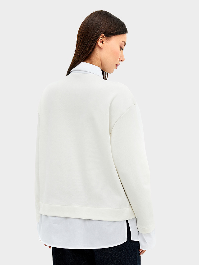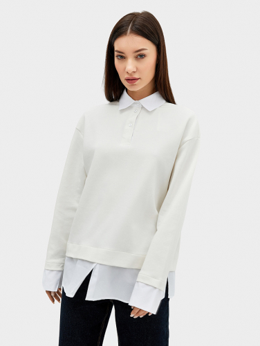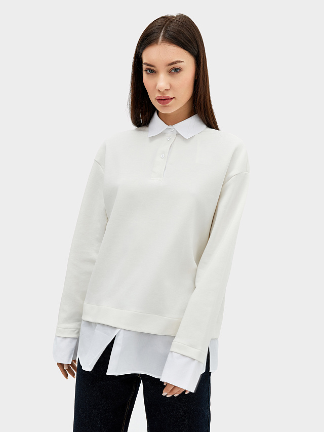 Уютный джемпер женский свободного кроя из плотного трикотажного полотна - интерлока с отделочными деталями из ткани - поплина. Отделочные детали имитируют выправленную из-под низа изделия рубашку. В боковых швах выполнены разрезы. Горловина обработана отделочным элементом - стояче-отложным воротником с отрезной стойкой. Воротник выполнен из отделочного полотна. На передней детали есть застежка-планка на три рубашечных пуговицы на два прокола на застежке-планке. Плечо спущено, пройма углублена, рукав втачной длинный с манжетами. Стильная и комфортная модель для создания оригинальных образов на каждый день!