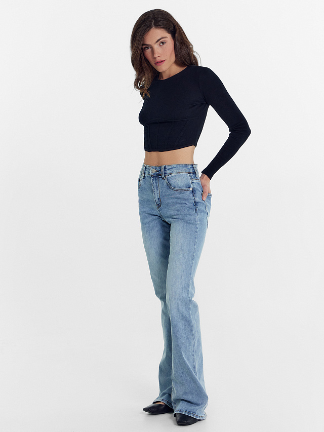 Эффектный укороченный джемпер женский с имитацией корсета — это модная и современная модель, которая сочетает в себе женственность и удобство. Имеет приталенный силуэт, комфортен и практичен в использовании. Горловина круглой формы. Передняя деталь переда с фигурным подрезом под грудью и вытачками. Рукав втачной длинный узкий. Спинка цельнокроеная. Низ джемпера фигурный, перед длиннее спинки. Идеально подходит как для повседневного образа, так и для особенных случаев. Выполнен из высококачественного хлопка, обеспечивающего тепло и комфорт в носке. Такой джемпер позволит выглядеть стильно и привлекательно в любой ситуации. Рекомендуем!