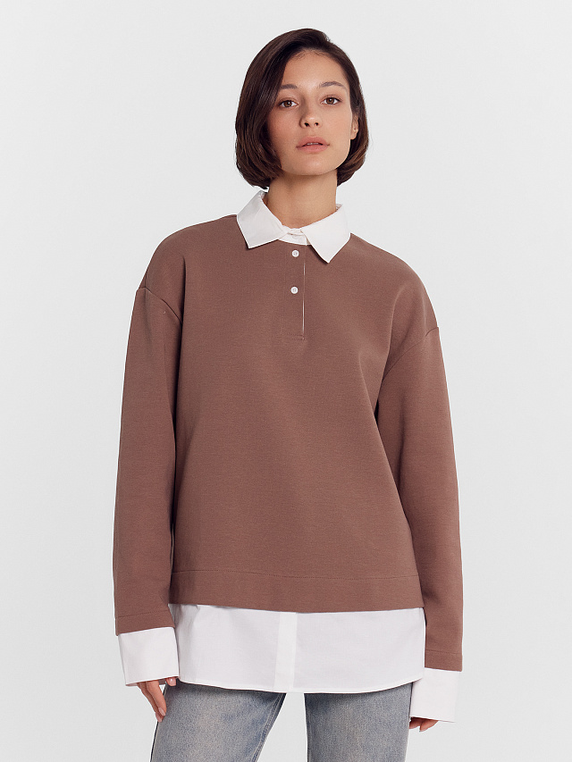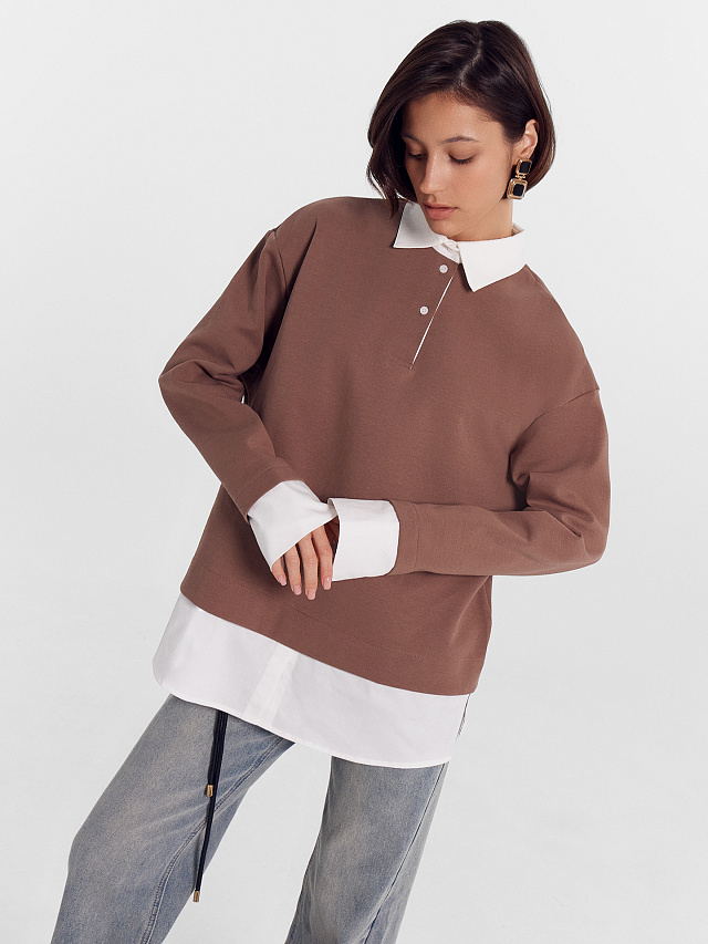 Уютный джемпер женский свободного кроя из плотного трикотажного полотна - интерлока с отделочными деталями из ткани - поплина. Отделочные детали имитируют выправленную из-под низа изделия рубашку. В боковых швах выполнены разрезы. Горловина обработана отделочным элементом - стояче-отложным воротником с отрезной стойкой. Воротник выполнен из отделочного полотна. На передней детали есть застежка-планка на три рубашечных пуговицы на два прокола на застежке-планке. Плечо спущено, пройма углублена, рукав втачной длинный с манжетами. Стильная и комфортная модель для создания оригинальных образов на каждый день!
