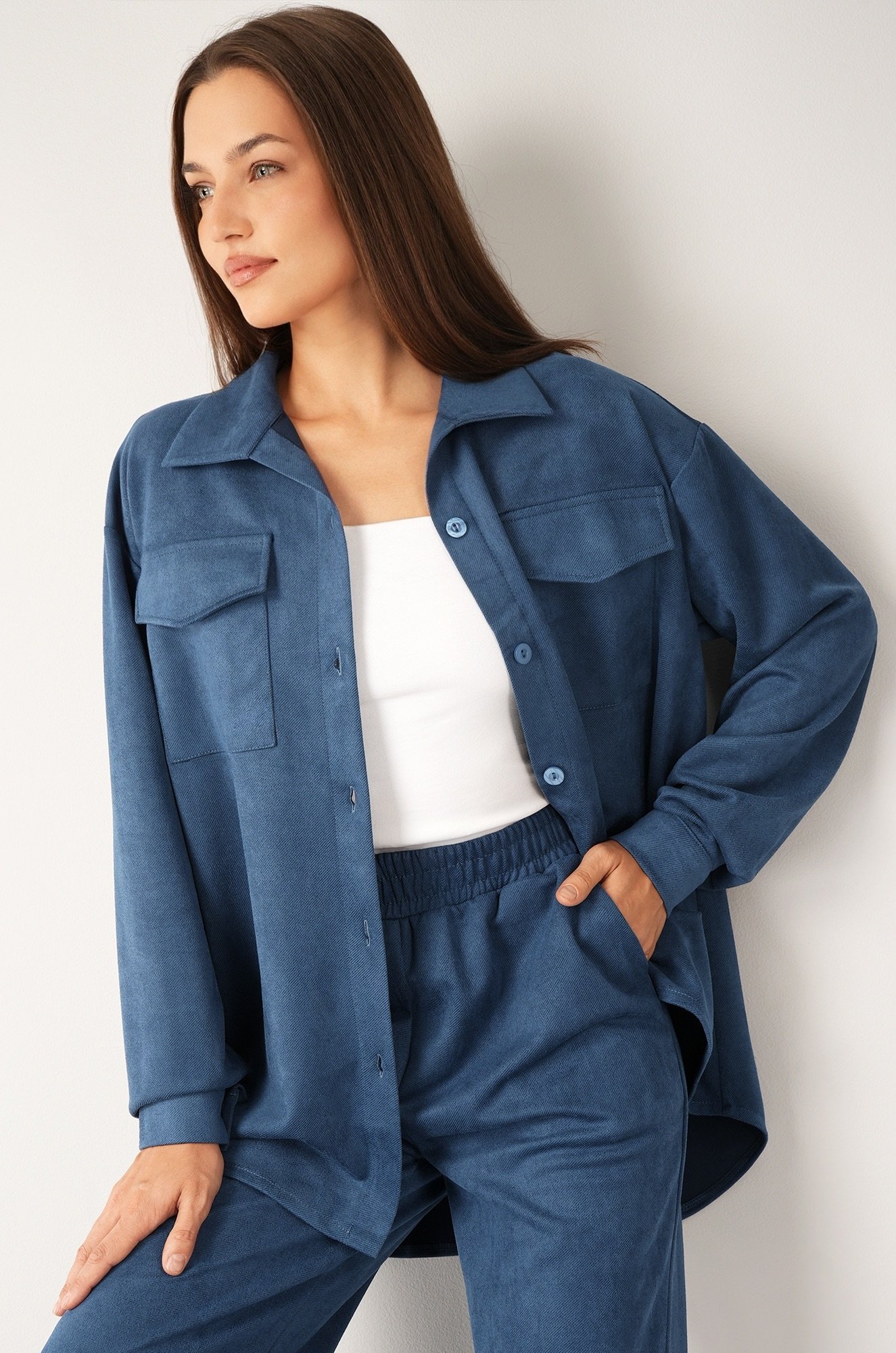 Брюки палаццо на резинке и рубашка оверсайз с нагрудными карманами создают женский комплект, который одинаково уместен для девушек и женщин и в офисе, и на прогулке. Синий вельветовый костюм будет незаменим как базовый, даря комфорт в осенний или весенний сезон.