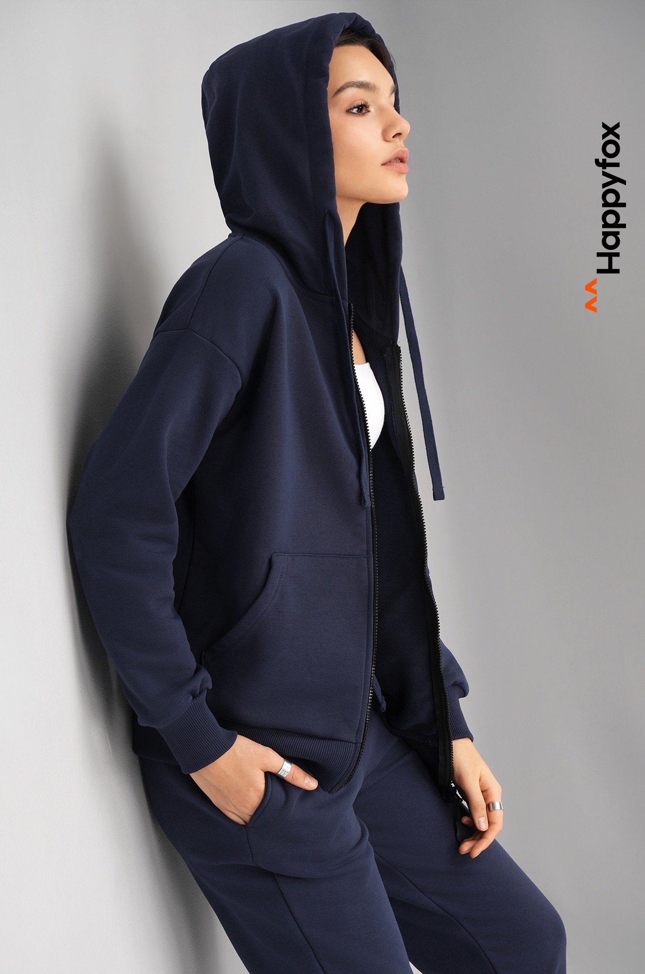 — костюм с толстовкой с глубоким капюшоном дарит уют и комфорт;