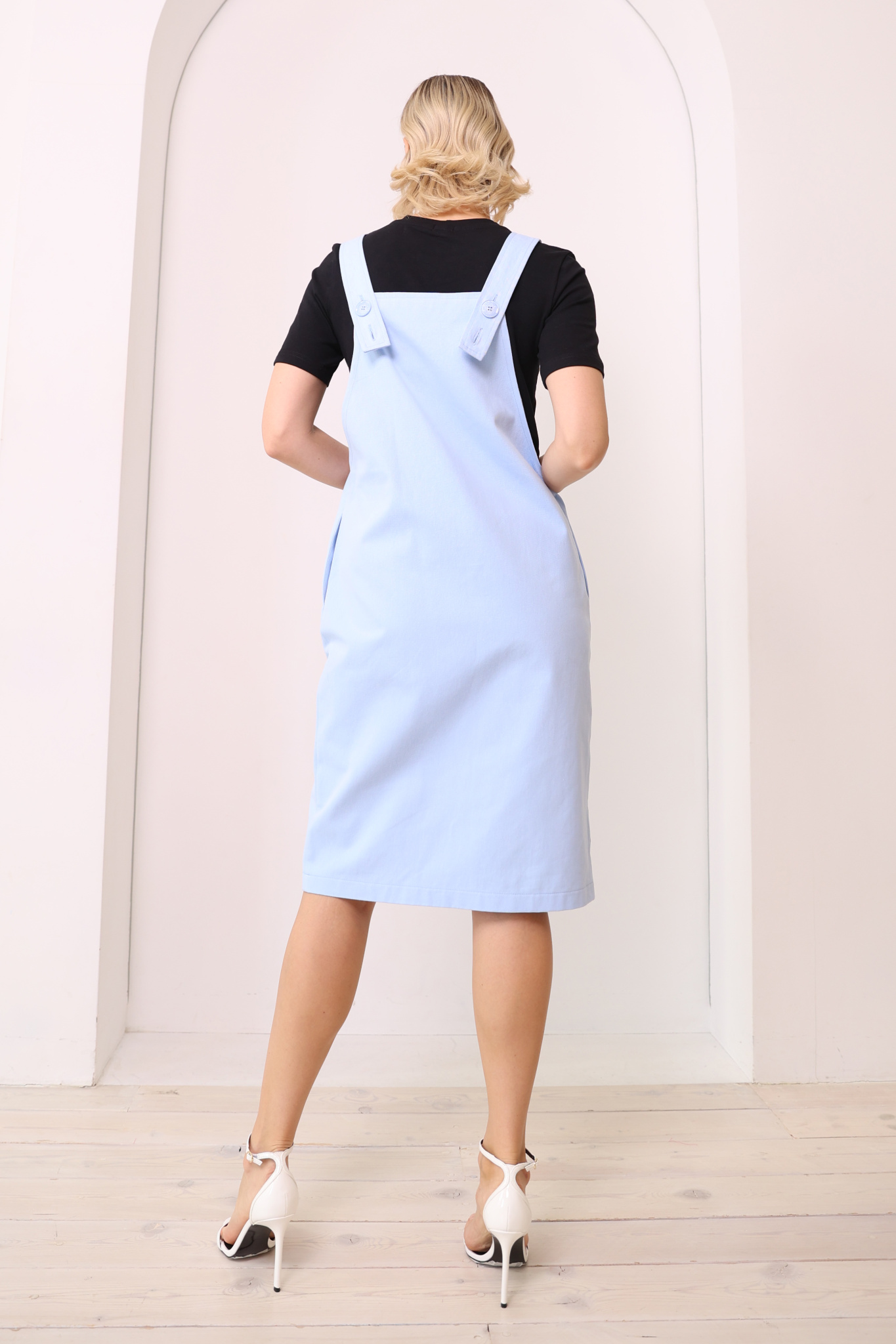 Сарафан прямого кроя на бретелях, углубленной проймой и карманами в боковых швах. Бретели регулируются по длине на спинке с помощью дополнительной петли для пуговицы. Ткань: хлопок джинс.