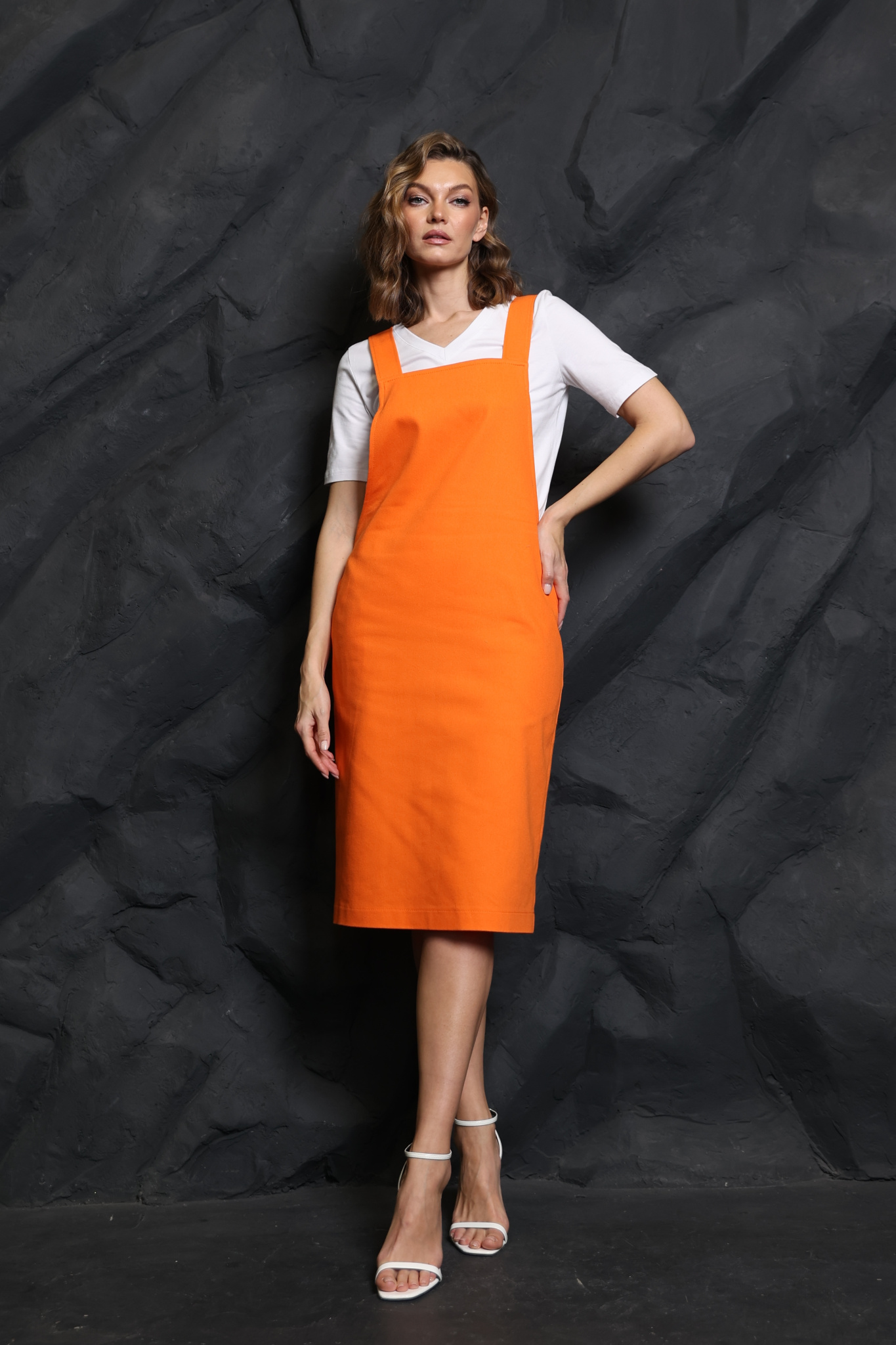 Сарафан прямого кроя на бретелях, с углубленной проймой и карманами в боковых швах. Бретели регулируются по длине с помощью дополнительной