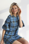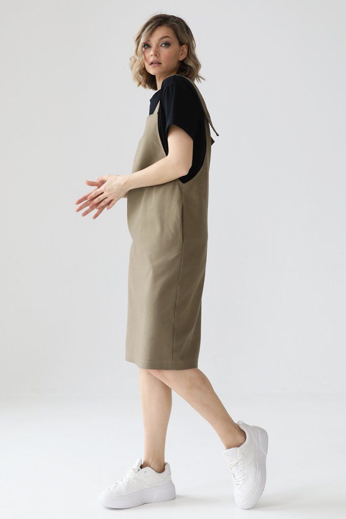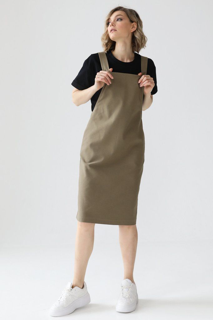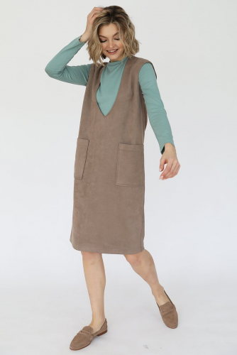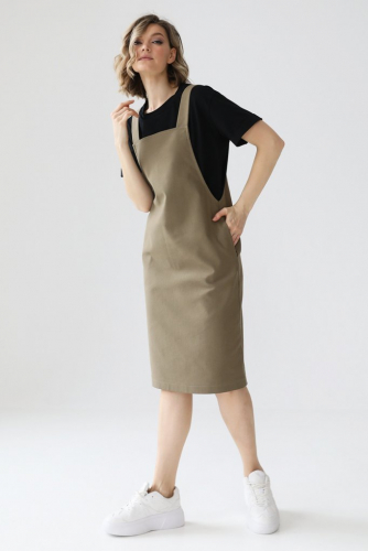 Джинсовый сарафан прямого кроя на бретелях, углубленной проймой и карманами в боковых швах.