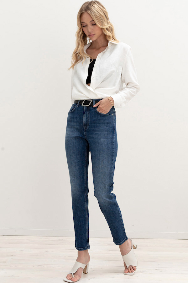 Брюки из эластичного денима, зауженные книзу выполнены по классической джинсовой технологии (варка с эффектом легкого выбеливания). На задней части брюк выполнены накладные карманы, на передней - карманы с подкройным бочком. Притачной пояс со шлёвками. Застёжка на молнию-гульфик и пуговицу.