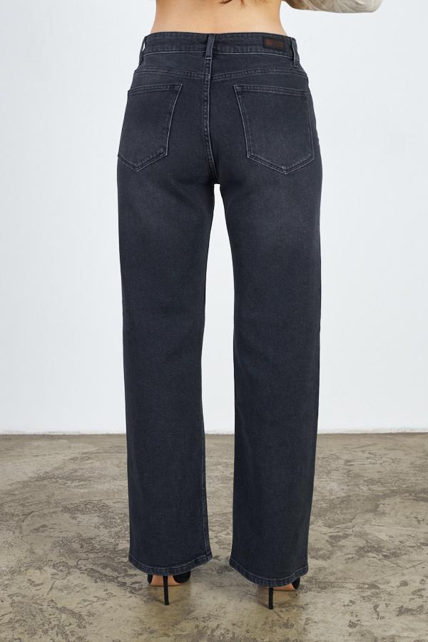 Брюки из эластичного денима выполнены по классической джинсовой технологии (варка с эффектом легкого выбеливания). Прямой классический крой. На задней части брюк выполнены накладные карманы, на передней - карманы с подкройным бочком. Притачной пояс со шлёвками. Застёжка на молнию-гульфик и пуговицу.