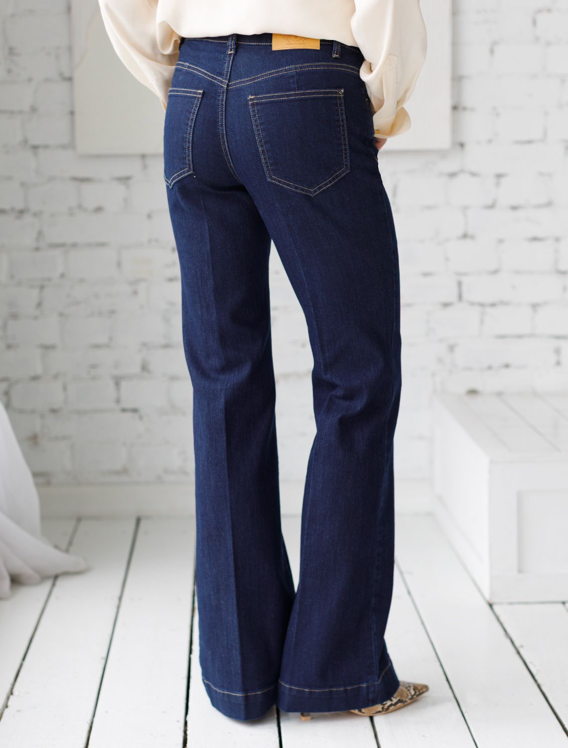 Джинсы клеш от колена глубокого темно-синего цвета выполнены из облегченного эластичного денима плотностью 10 OZ, который отлично тянется и мягко садится по фигуре. Эластичный материал дарит свободу движений, а облегченная ткань делает эти джинсы идеальным выбором на каждый день. Клеш от колена выгодно вытягивает силуэт, визуально удлиняет ноги и подчеркивает округлые бедра, создавая женственный образ без лишних усилий. Джинсы подходят на большие размеры, позволяя чувствовать себя уверенно, специальный крой выгодно выделяет достоинства и мягко маскирует возможные нюансы фигуры. Flare Jeans легко впишутся в гардероб, дополнят повседневный или более яркий образ. Джинсы подходят тем, кто ценит уверенность в себе и всегда выбирает лучшее для своей фигуры.