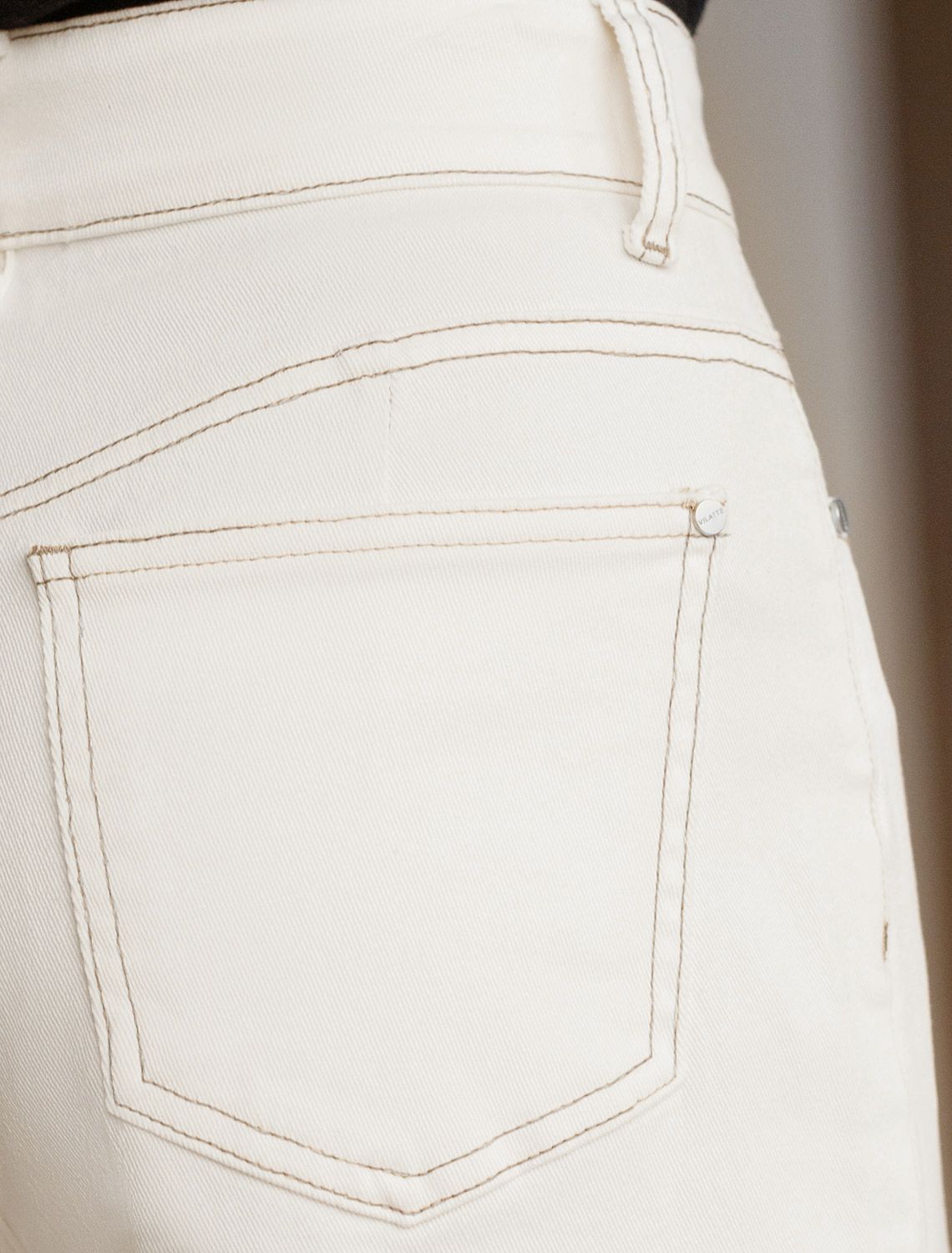 Джинсы-трубы в теплом белом оттенке выполнены из эластичного денима. Модель в теплом белом оттенке дополнена контрастными бежевыми строчками. Посадка на талии и свободный крой подчеркивают фигуру и вытягивают силуэт. Изделие дополнено фирменным патчем.