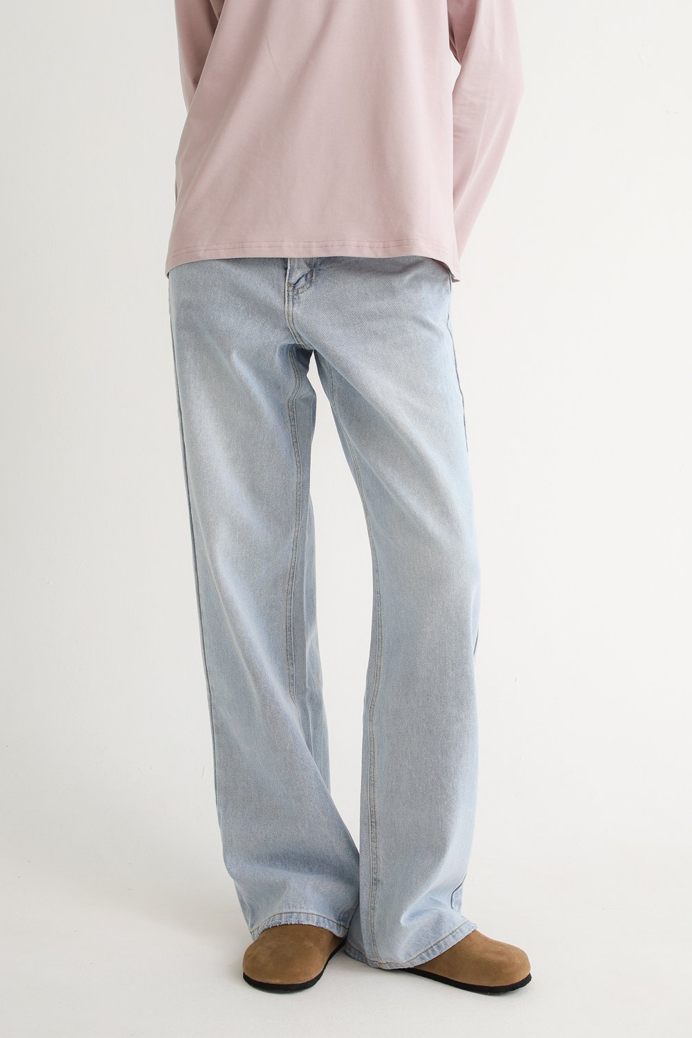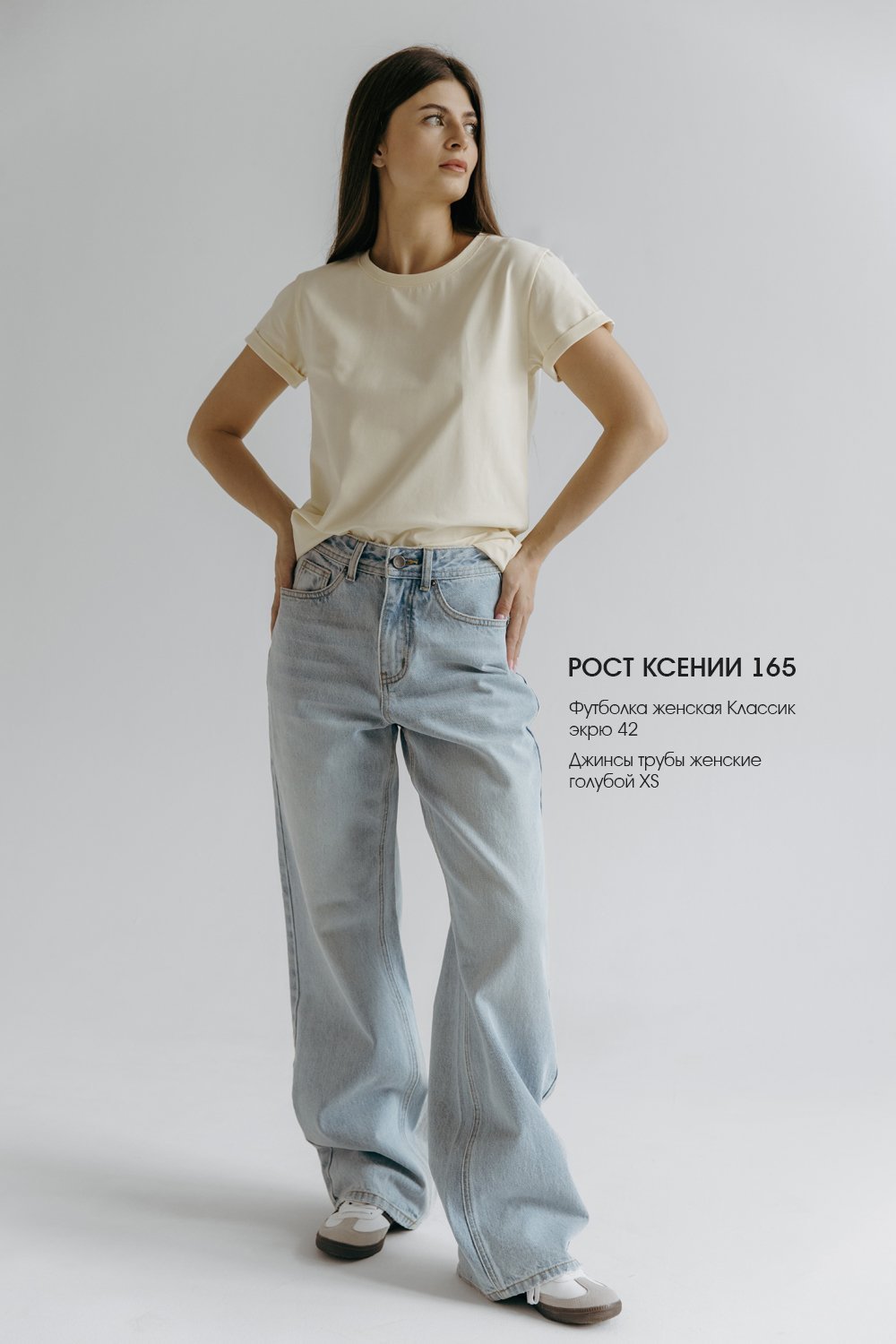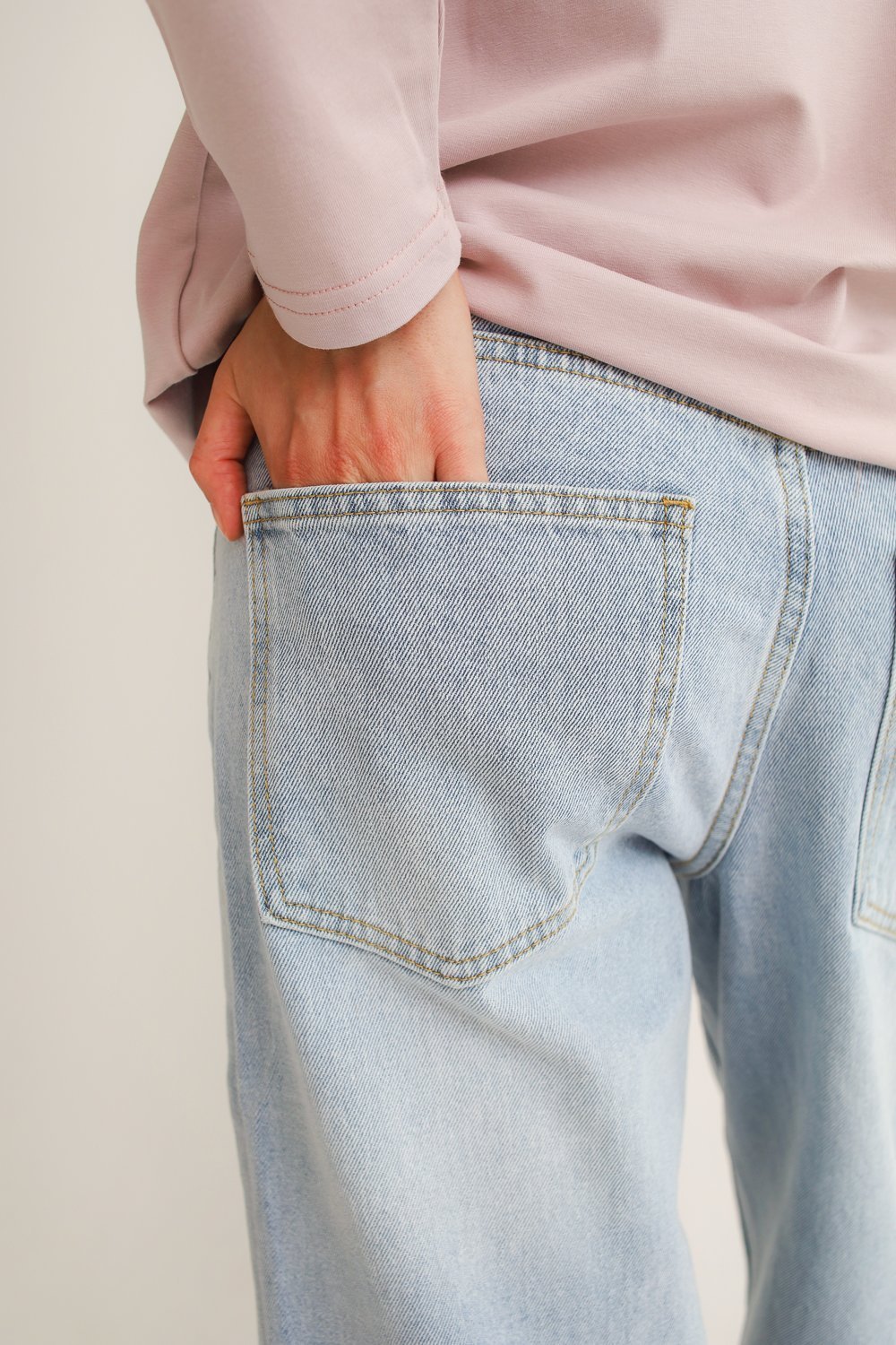 Джинсы-трубы с классическими пятью карманами. Застежка на пуговицу-кнопку и металлическую молнию, передние карманы с закрепками на клепки.