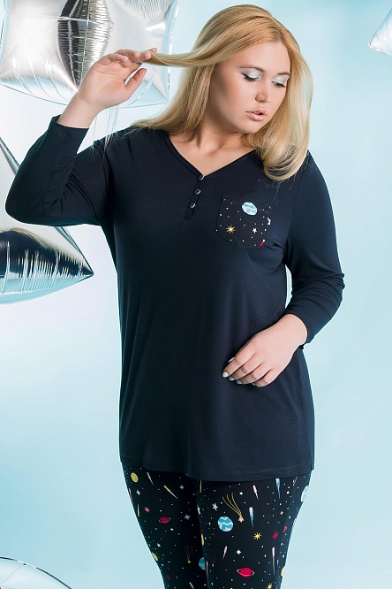 Модель украшена пришивным карманом из набивной ткани, а V-образный вырез декорирован планкой на пуговицах.