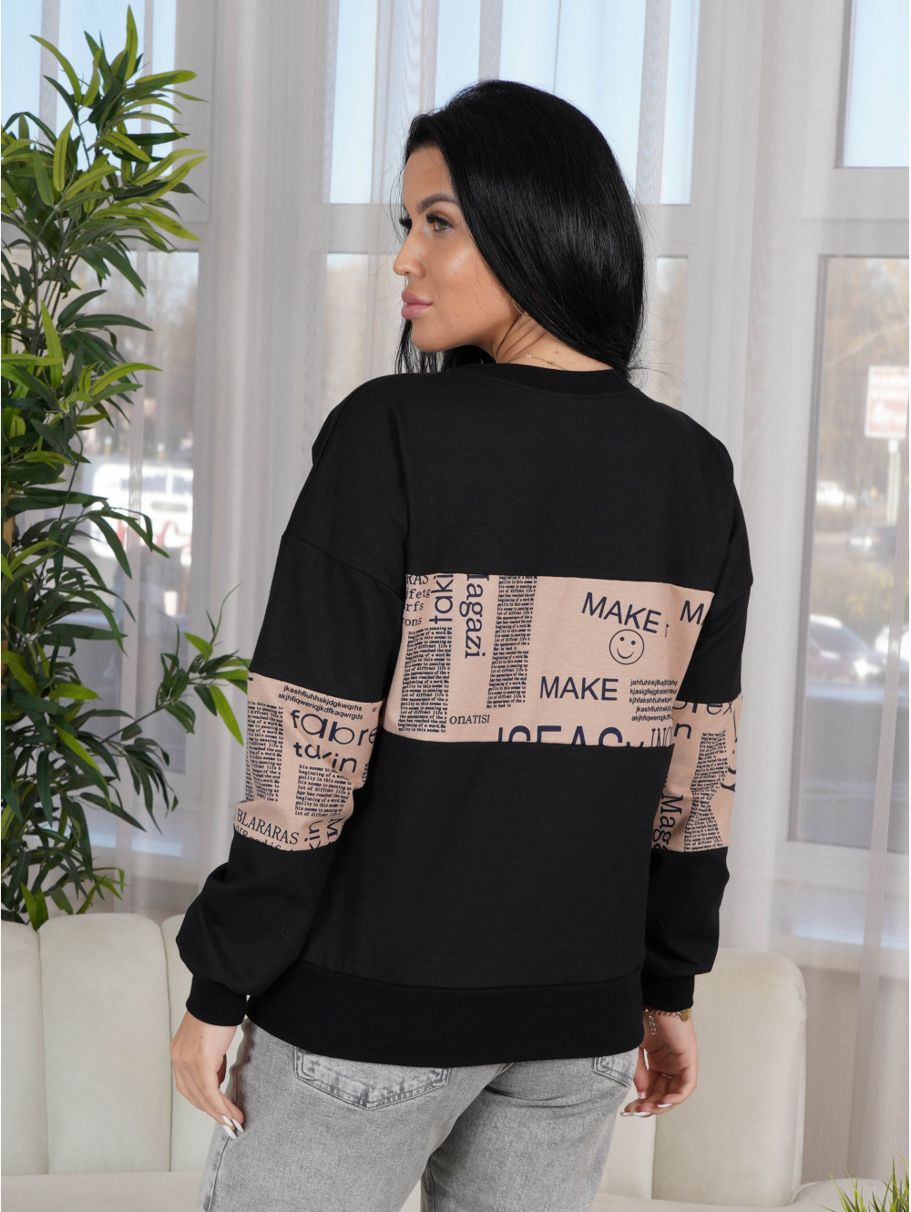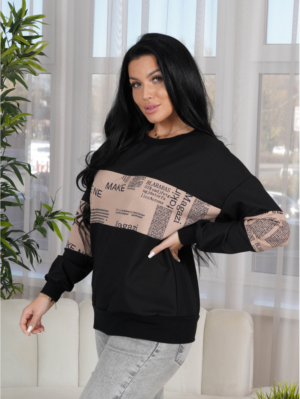 Удобный крой, не сковывающий движений; отсутствие пуговиц, молний, шнуровок; горловина кофты, выполненная круглым вырезом; рукава и низ изделия на манжете из рибаны.