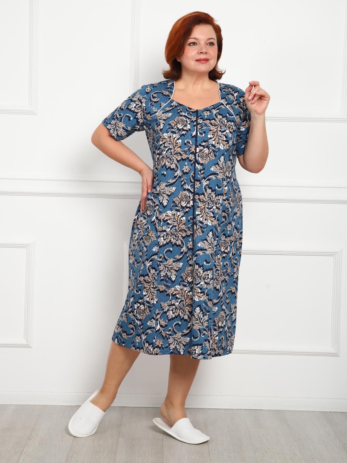 Халат домашний на молнии с коротким рукавом с рельефом по груди. Кокетка выполнена с атласным кантом. Имеются боковые карманы. Удлиненная модель с поясом в боковых швах.