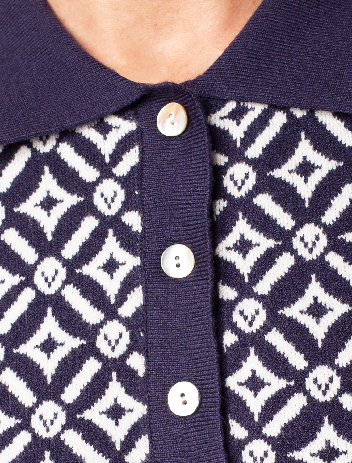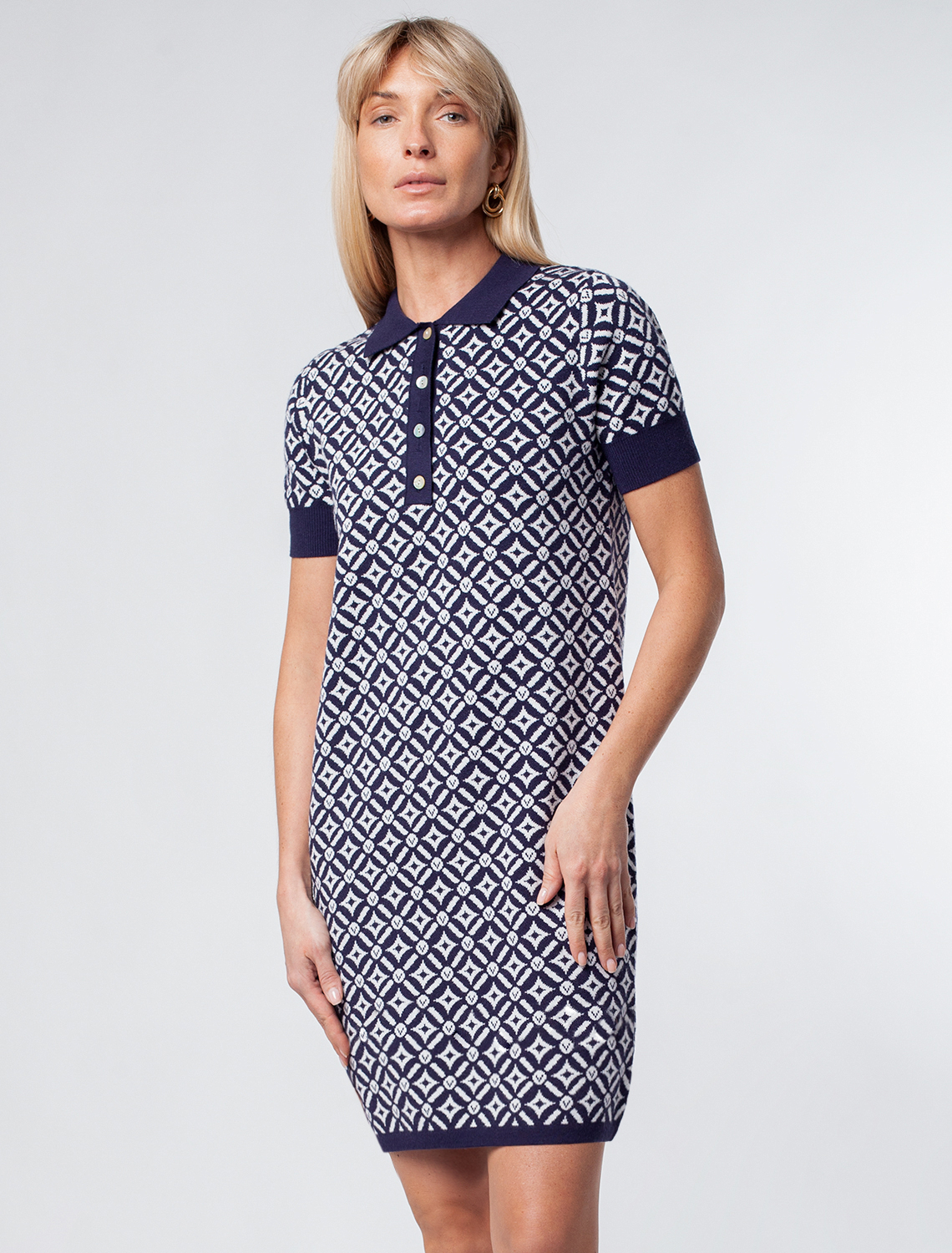 Платье длины мини с воротником поло выполнено из мягкого трикотажа на основе шелковистой эластичной вискозы. Жаккардовое переплетение образует геометрический узор. Застежка на перламутровые пуговицы подчеркивает гладкость пряжи. Контрастный воротник и манжеты делают узор еще более выразительным. Можно сочетать с жакетом D31.388 из жаккардовой коллекции.