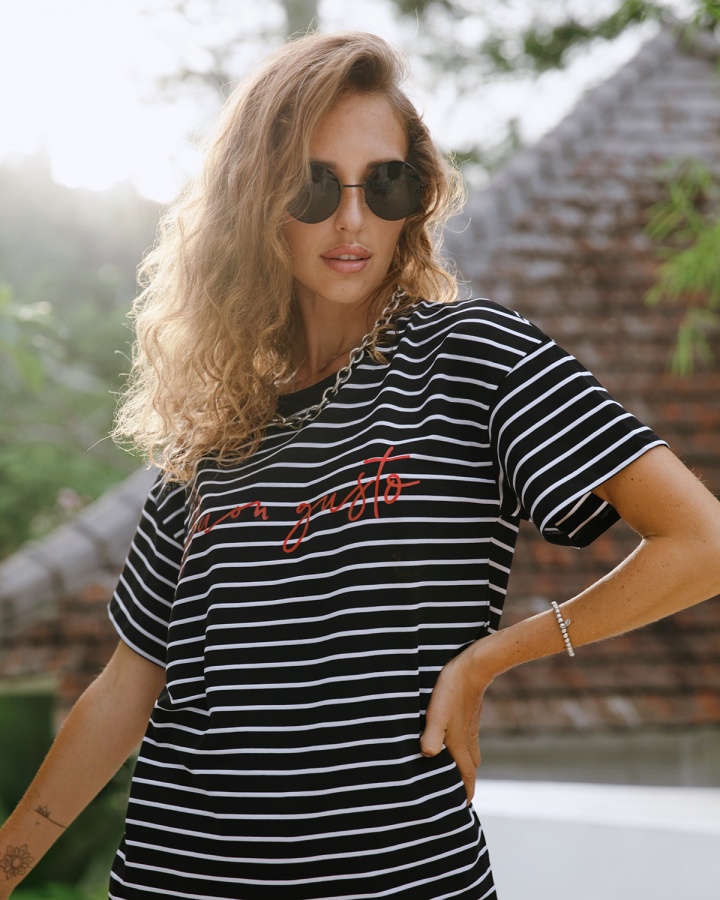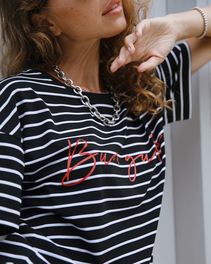 Футболка свободного кроя, которая станет прекрасным дополнением к базовому летнему гардеробу. Полоска актуальна всегда и подходит тем, кому скучно носить простые белые вещи. Футболка оверсайз кроя создает актуальный расслабленный образ. Рукава со спущенной линией плеча прекрасно дополняют его и делают так, что изделие отлично сидит на разных типах фигур. Широкие плечи или узкие — она одинаково хорошо будет смотреться на всех.