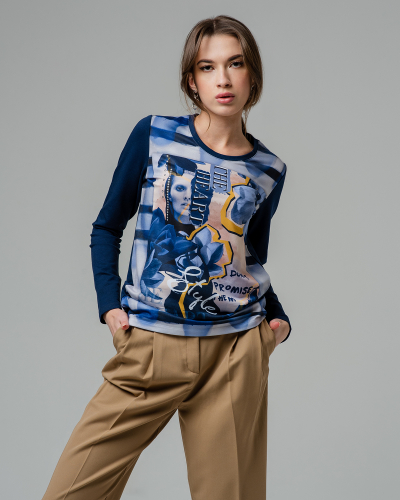 Комфортный лонгслив классического кроя, спинка и рукава 3/4 изделия выполнены из трикотажа, на полочку нанесен авторский рисунок. Принт не тускнеет, смотрится свежо и ярко даже после многочисленных стирок. 60% вискоза, 40% полиэстер