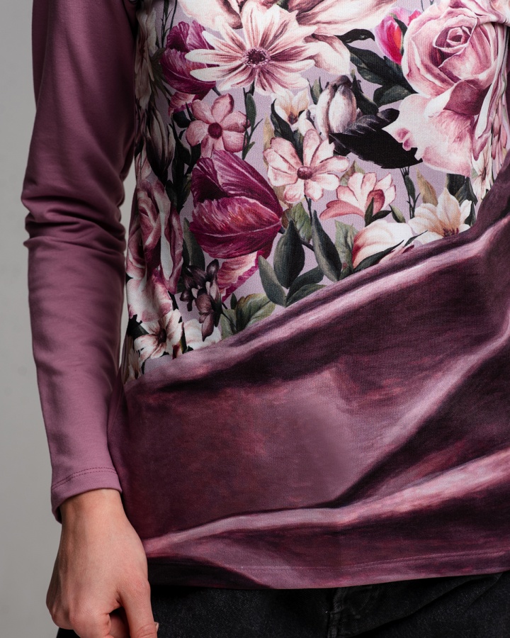 Трикотажная кофта с длинным рукавом сделана из двух видов ткани: спереди вискозное полотно с принтом, а сзади однотонный хлопковый футер двунитка.