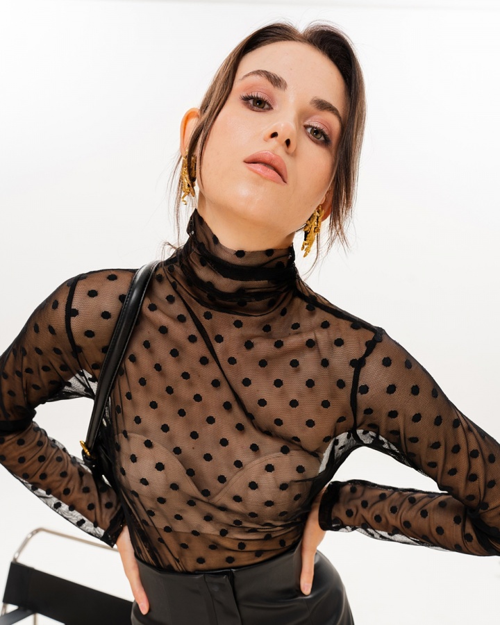 Водолазка из сетки с принтом не слишком просвечивается, белье почти не заметно. Так что можно носить и как самостоятельную единицу.