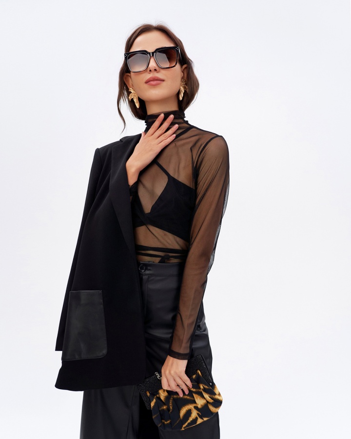 Водолазка из сетки с принтом не слишком просвечивается, белье почти не заметно. Так что можно носить и как самостоятельную единицу.