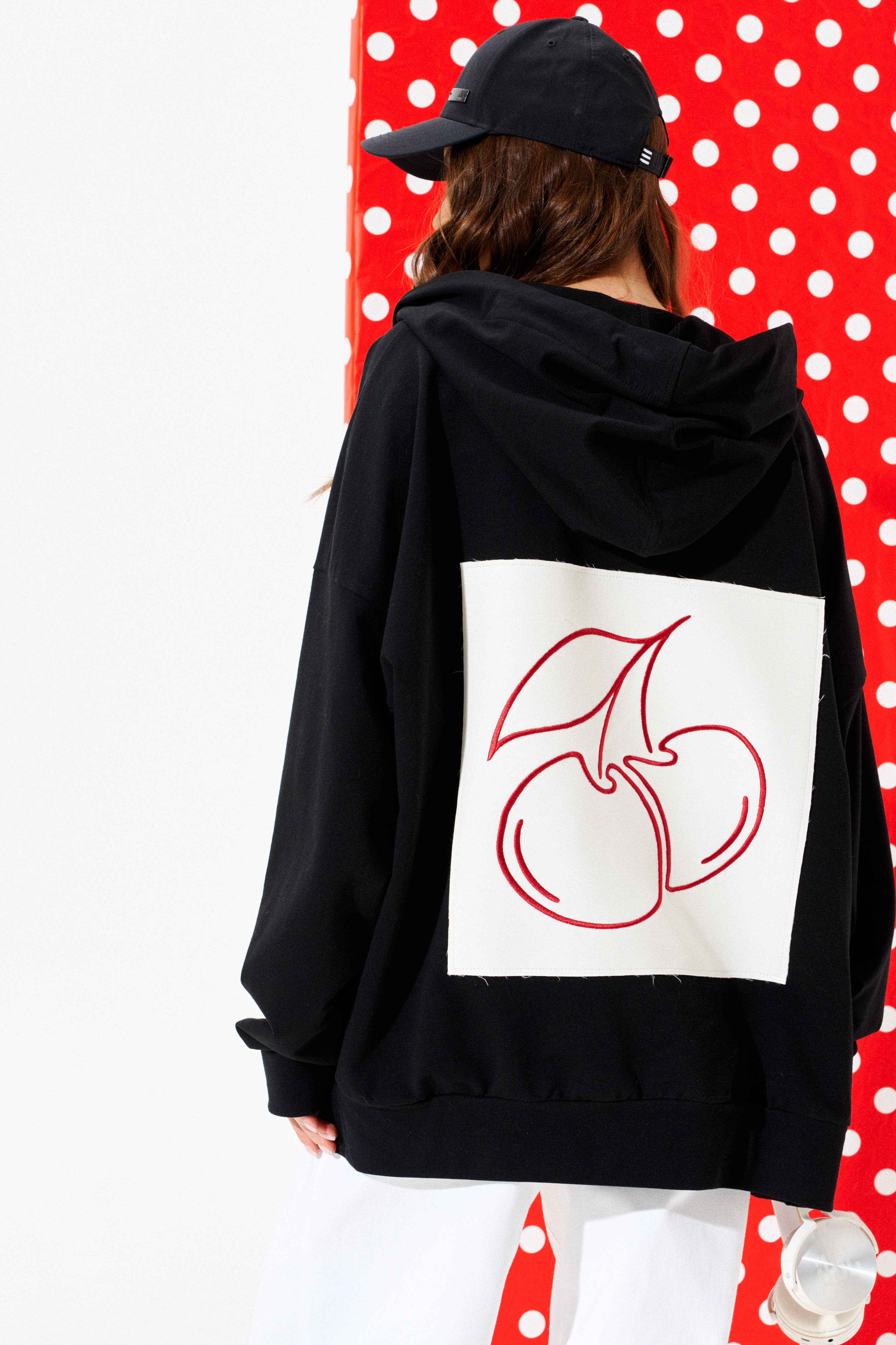 3952 толстовка женская 31409-2009 черный 46-54 95% хлопок, 5% эластан Толстовка из трикотажного полотна свободного объема, прямого силуэта, с капюшоном и центральной застежкой на тесьму-молнию. Детали переда с накладными карманами. Спинка цельная с настрочной деталью с вышивкой «Вишня». Рукав втачной, одношовный, длинный. Низ изделия и рукава обработаны притачной манжетой. Капюшон на обтачке, одношовный, через обметанные петли в кулиску продет декоративный шнур с металлическими наконечниками. 3100