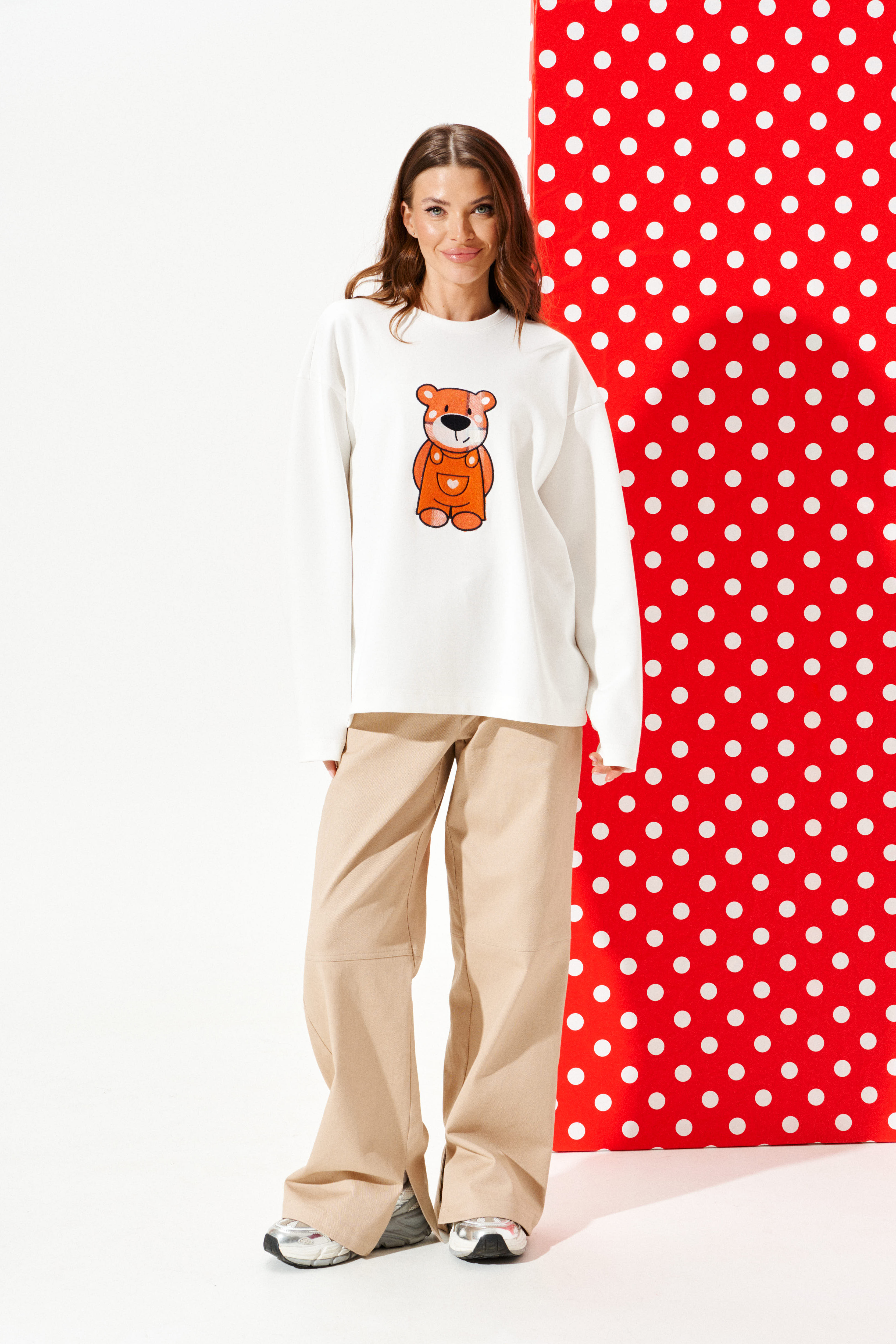 3973 джемпер женский молочный 44-52 95%хлопок 5%эластан Джемпер из трикотажного полотна свободного объема, прямого силуэта, с круглым вырезом горловины. Вырез горловины обработан притачной обтачкой. Перед и спинка цельные. По переду выполнена вышивка-аппликация <<Медвежонок>> из контрастных материалов. Рукав втачной, одношовный, длинный. 2800