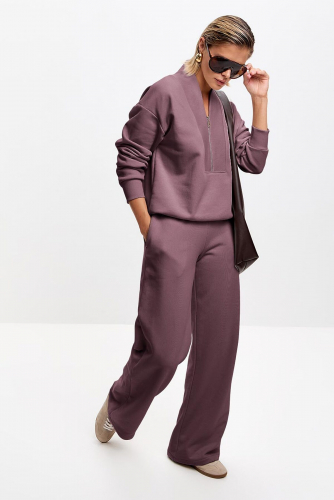 Базовые брюки с классической универсальной посадкой. Пояс на резинке с двойной отстрочкой и с манжетами на брючинах. Удобные боковые карманы.