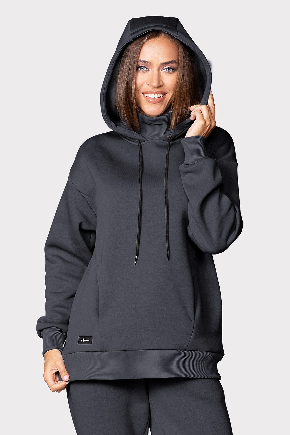 Худи свободного кроя, немного удлиненно, со спущенной линией плеча. Объемный капюшон со шнурами в дуэте с высоким воротом - идеальный вариант против ветра, холода и непогоды. Декорировано оригинальными боковыми швами с функциональными карманами. Манжет и низ изделия выполнены из качественного эластичного материала в рубчик.