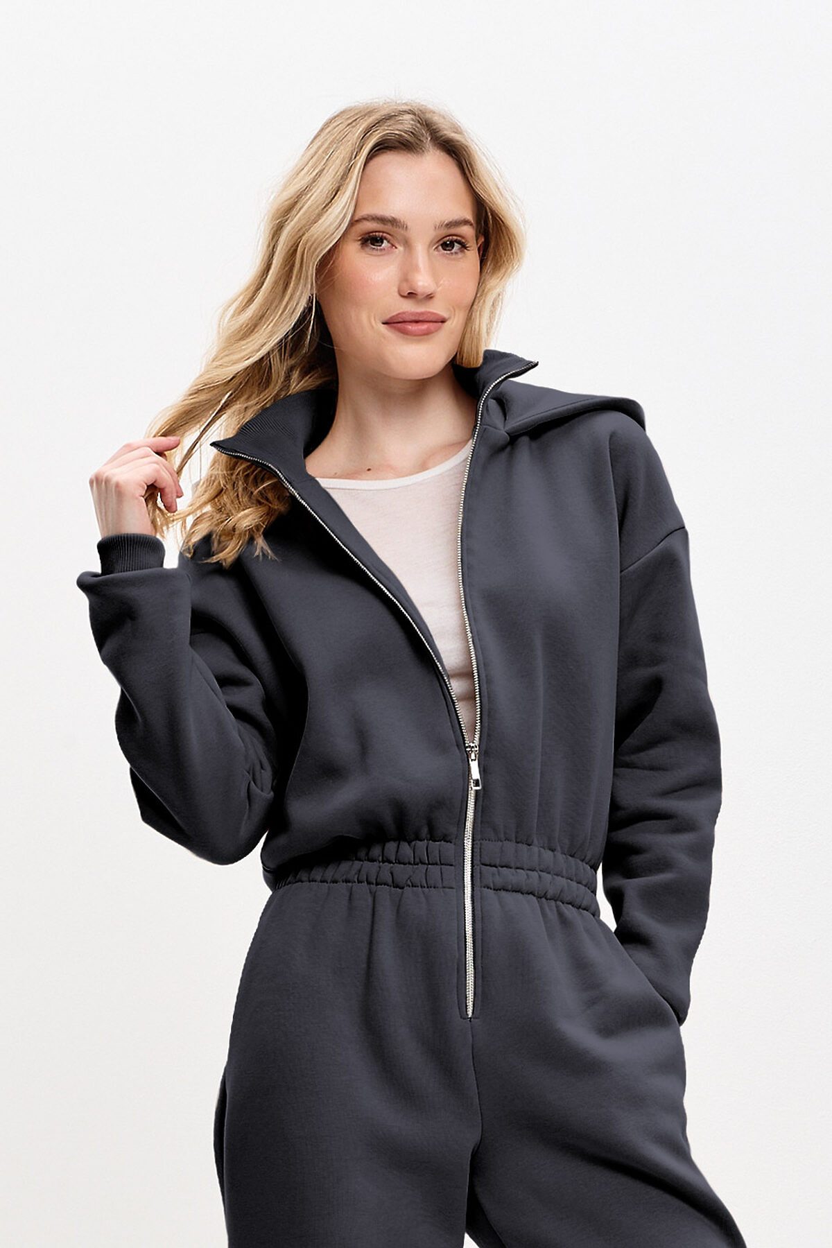 Стильный утепленный комбинезон для активного отдыха и прогулок. Комбинезон с высоким воротом и объемным капюшоном, широкого кроя, приталенного силуэта, на разъемной молнии.