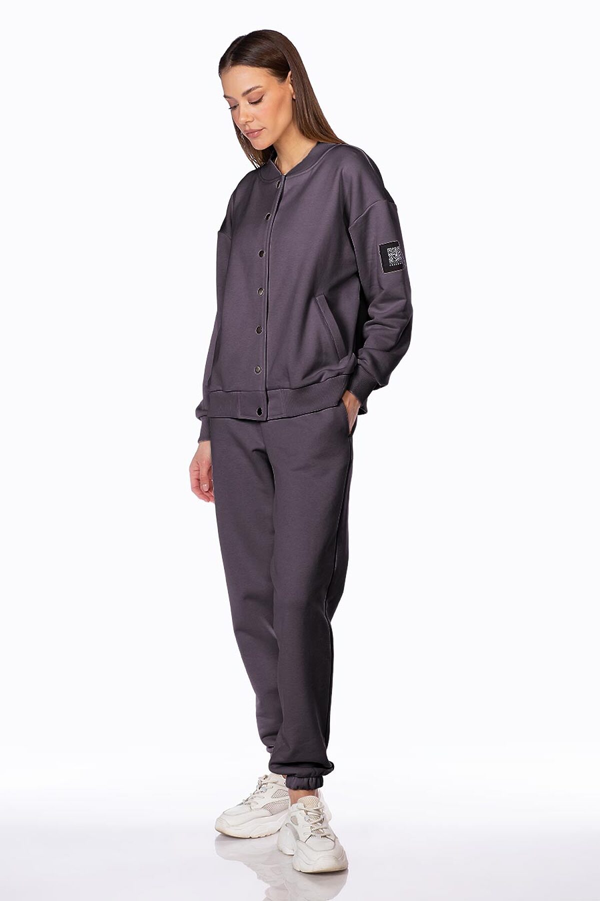Модель свободного кроя, с втачным рукавом, декорированным жаккардовым именным шевроном QR-код. Бомбер застегивается на кнопки, с удобными боковыми карманами. Низ изделия, манжеты и ворот выполнены из эластичного фактурного материала.