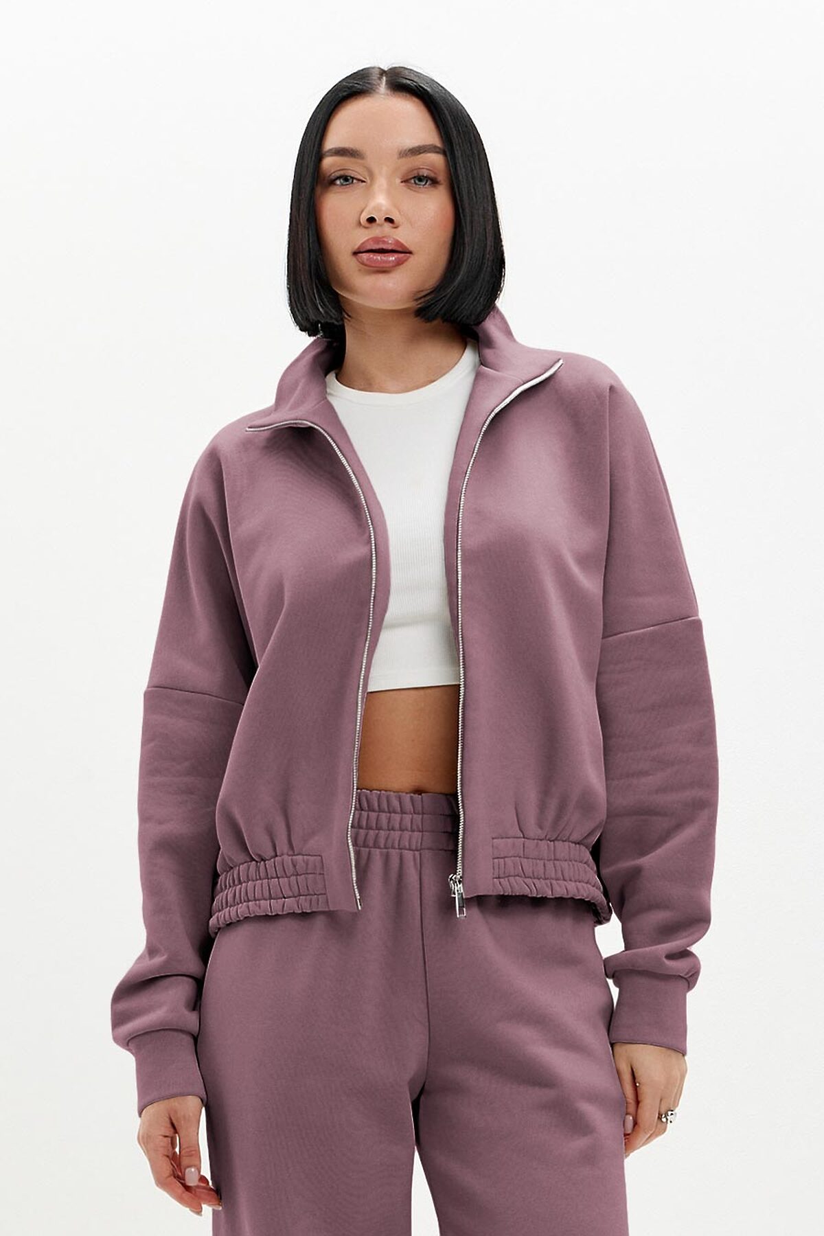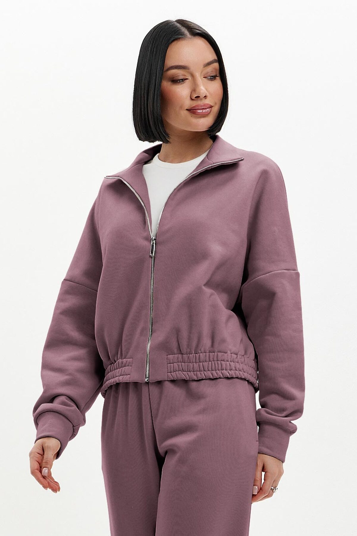 Толстовка на разъемной молнии. Ворот стойка и манжеты выполнены из основной ткани. Низ изделия на резинке с тройной отстрочкой.