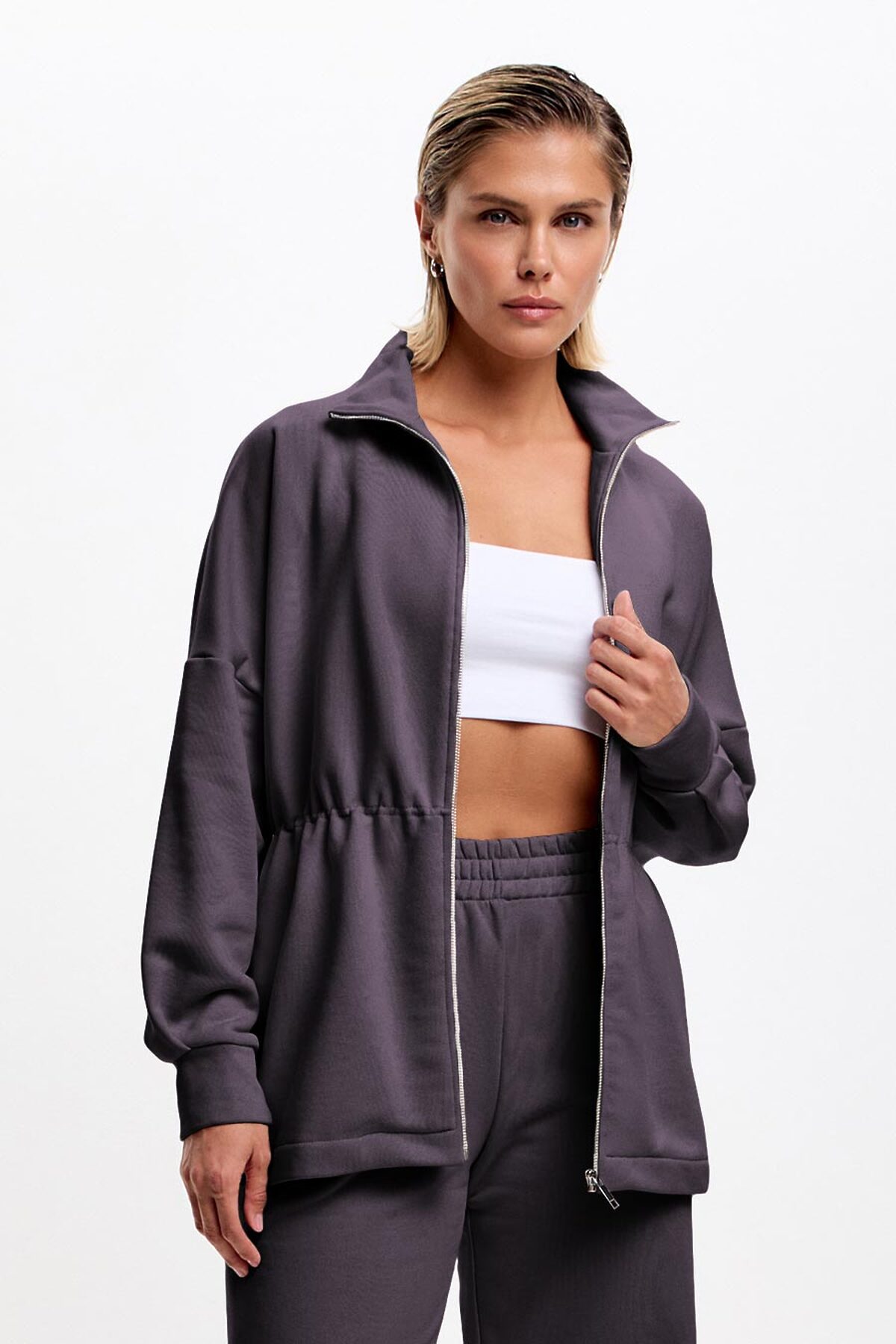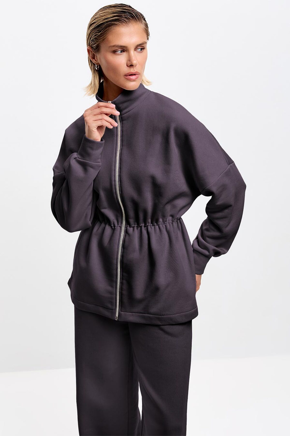 Удлиненная толстовка на разъемной молнии. Ворот стойка и манжеты выполнены из основной ткани. Талия подчеркнута кулиской на утяжках с фиксаторам по внутренней стороне.