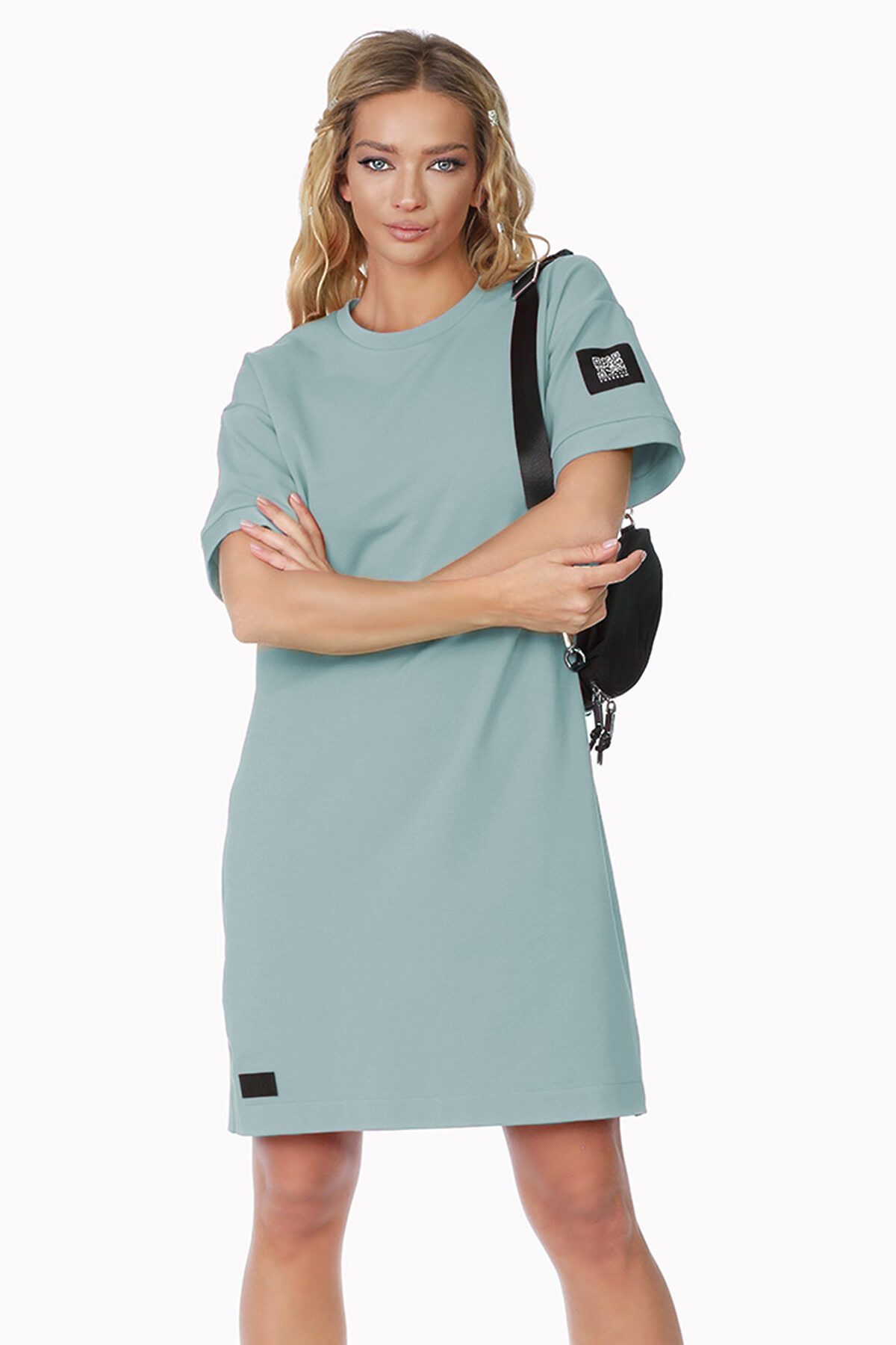 Модель с круглым вырезом горловины, коротким рукавом с оригинальной отделкой по краю. Платье декорировано кожаным брендированным лейблом и стильным жаккардовым шевроном QRкодом на плече.