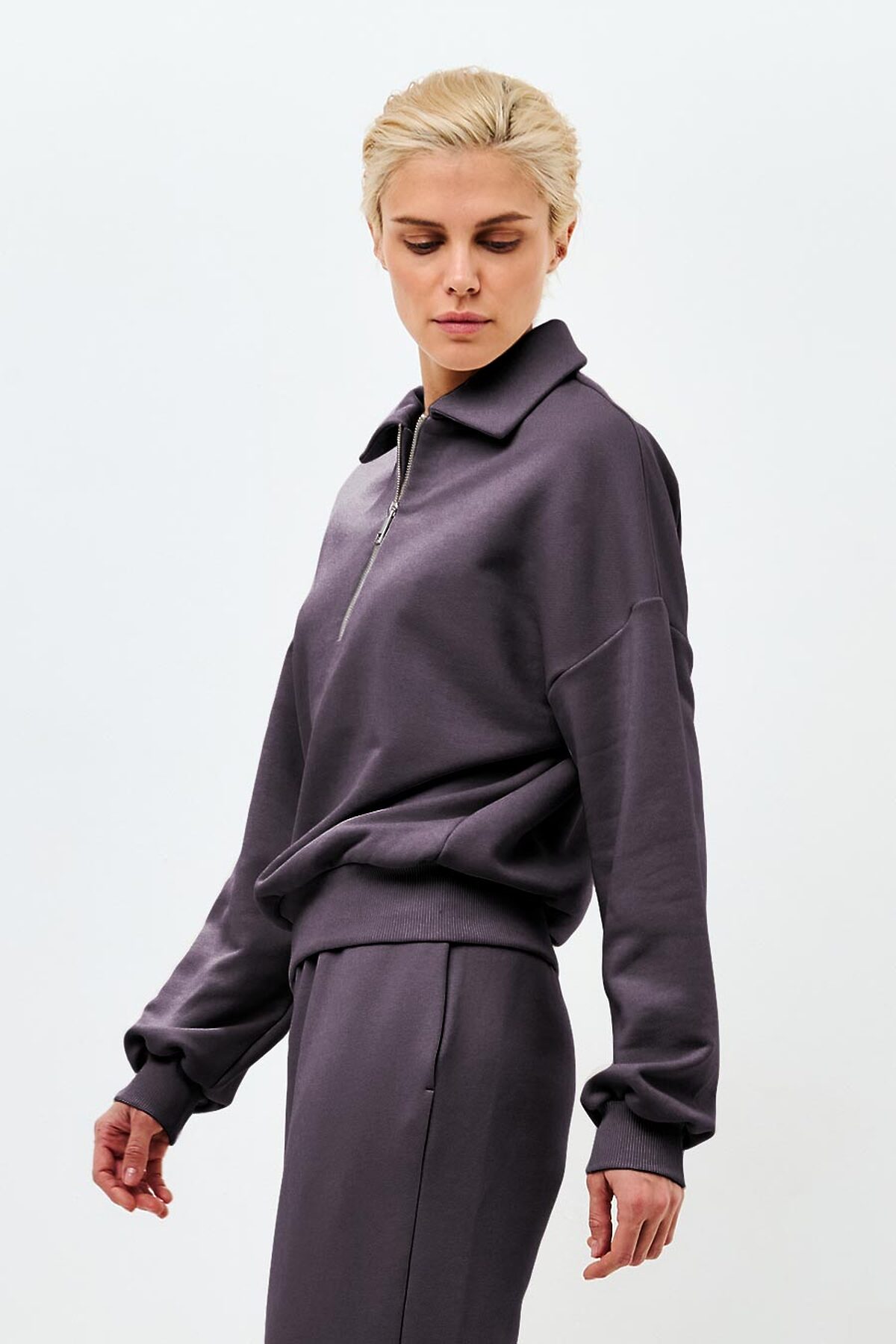 Свитшот с отложным воротничком на утонченной металлической молнии. Манжет и низ изделия выполнен из качественного эластичного материала в рубчик. Универсальный свитшот с длинным рукавом, который уместно будет смотреться и в офисе и на прогулке. Застегнутый под горло или элегантно расстегнут наполовину - можно носить по-разному.