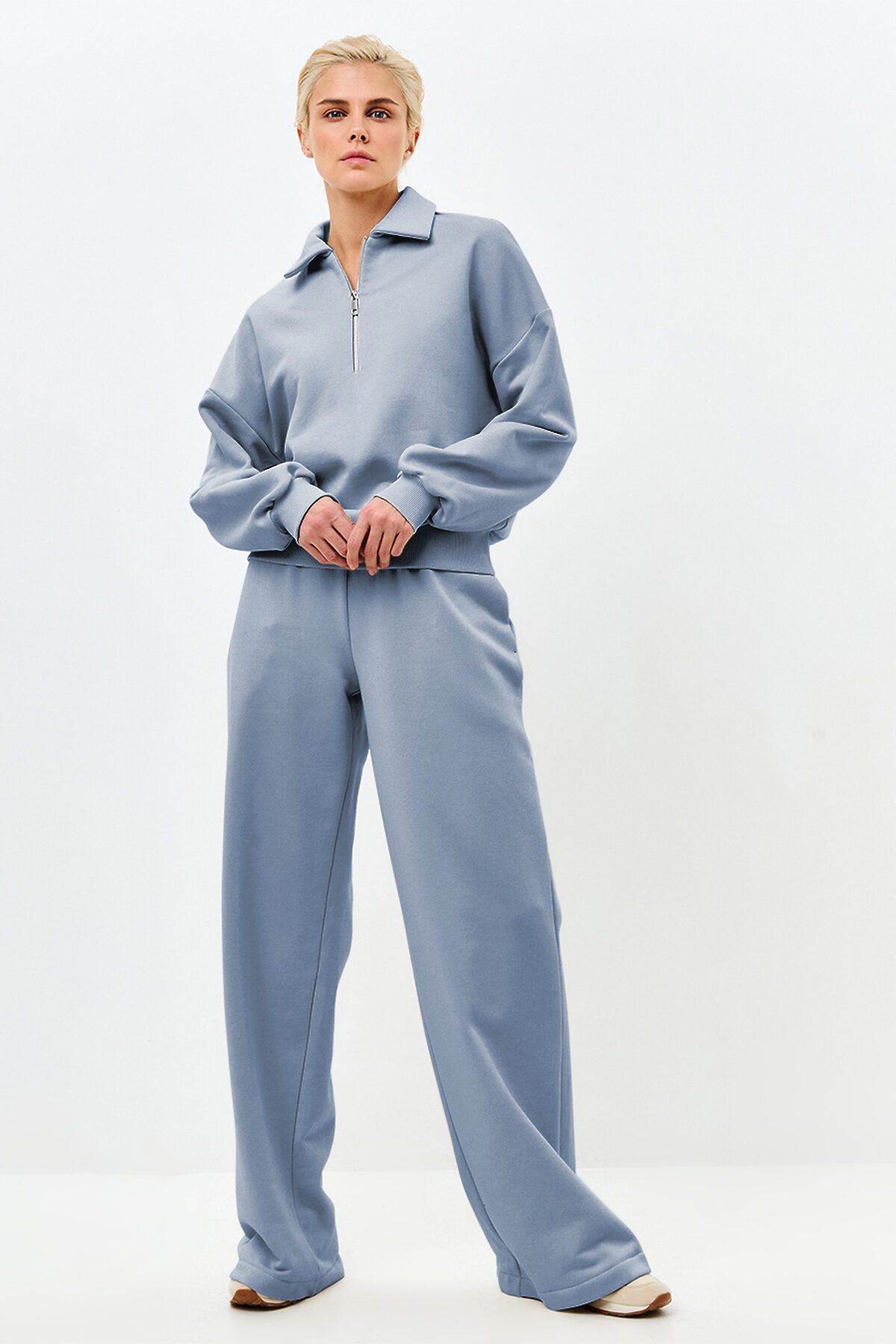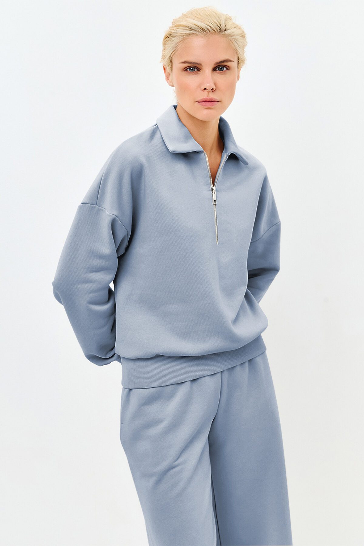 Свитшот с отложным воротничком на утонченной металлической молнии. Манжет и низ изделия выполнен из качественного эластичного материала в рубчик. Универсальный свитшот с длинным рукавом, который уместно будет смотреться и в офисе и на прогулке. Застегнутый под горло или элегантно расстегнут наполовину - можно носить по-разному.
