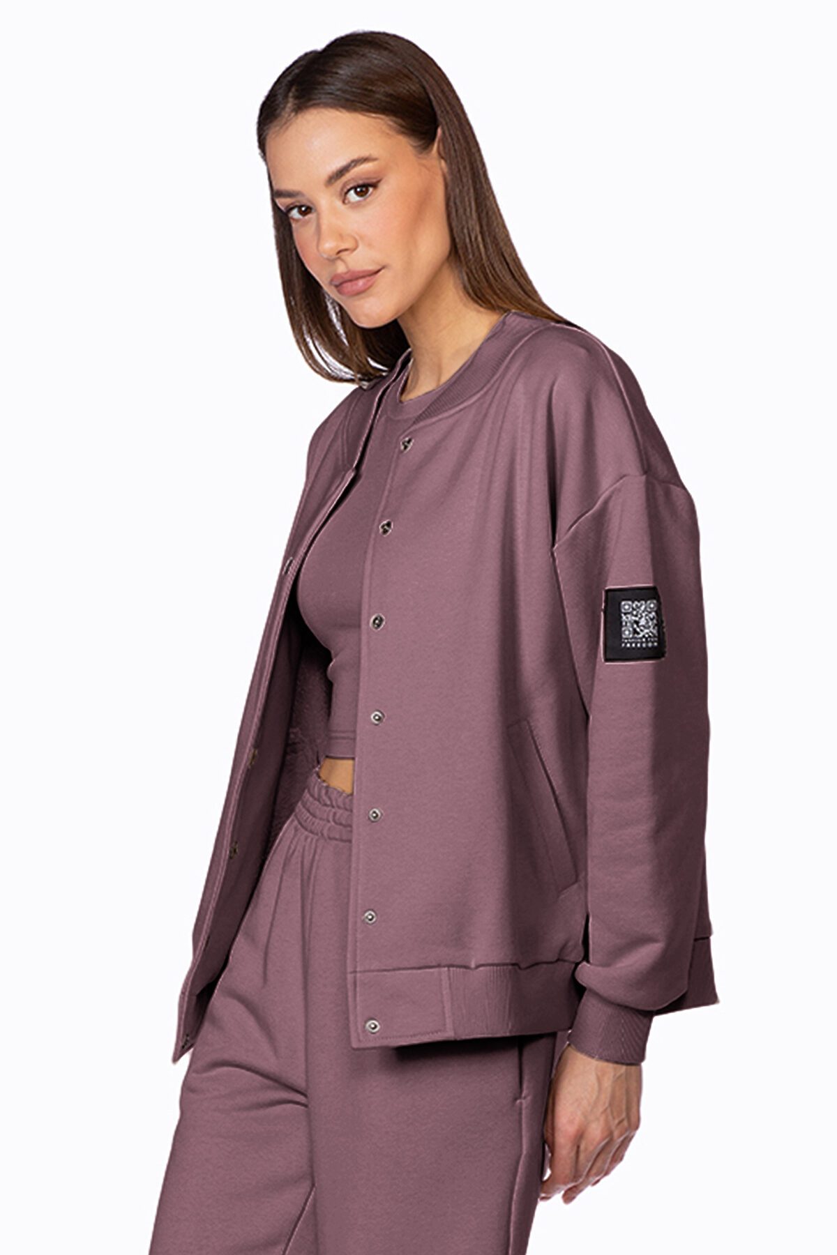 Модель свободного кроя, с втачным рукавом, декорированным жаккардовым именным шевроном QR-код. Бомбер застегивается на кнопки, с удобными боковыми карманами. Низ изделия, манжеты и ворот выполнены из эластичного фактурного материала.