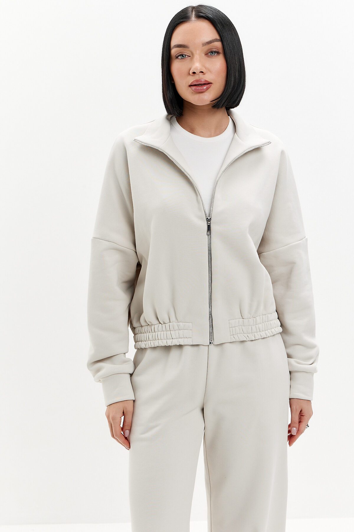 Толстовка на разъемной молнии. Ворот стойка и манжеты выполнены из основной ткани. Низ изделия на резинке с тройной отстрочкой.