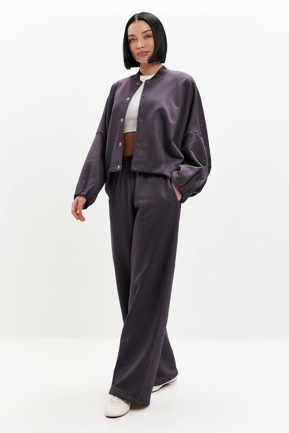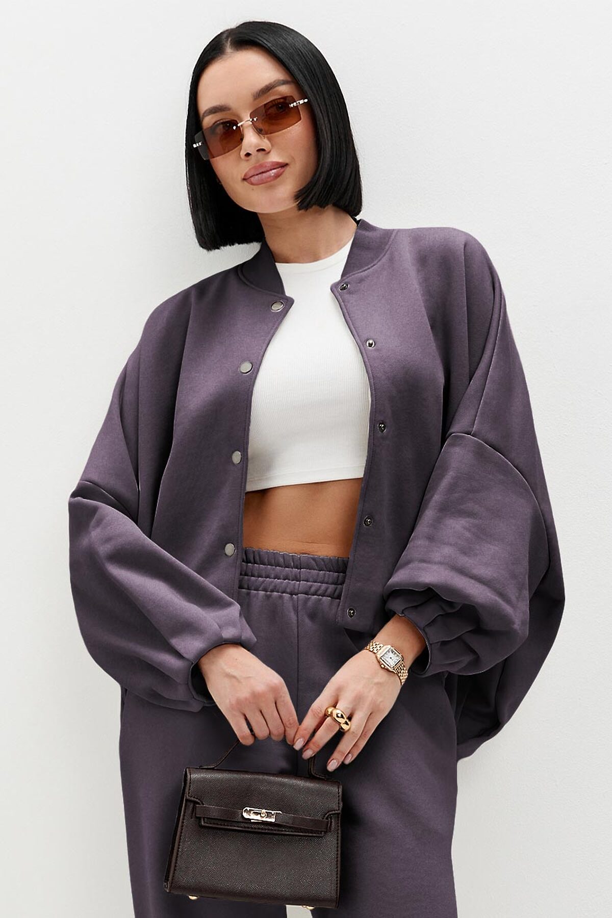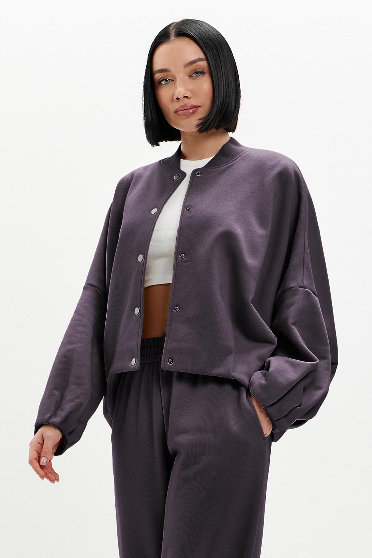 Модель оверсайз, с объемными рукавами силуэта "летучая мышь". Низ изделия и рукавов декорирован трендовой изящной складкой. Бомбер застегивается на кнопки, ворот выполнены из эластичного фактурного материала.