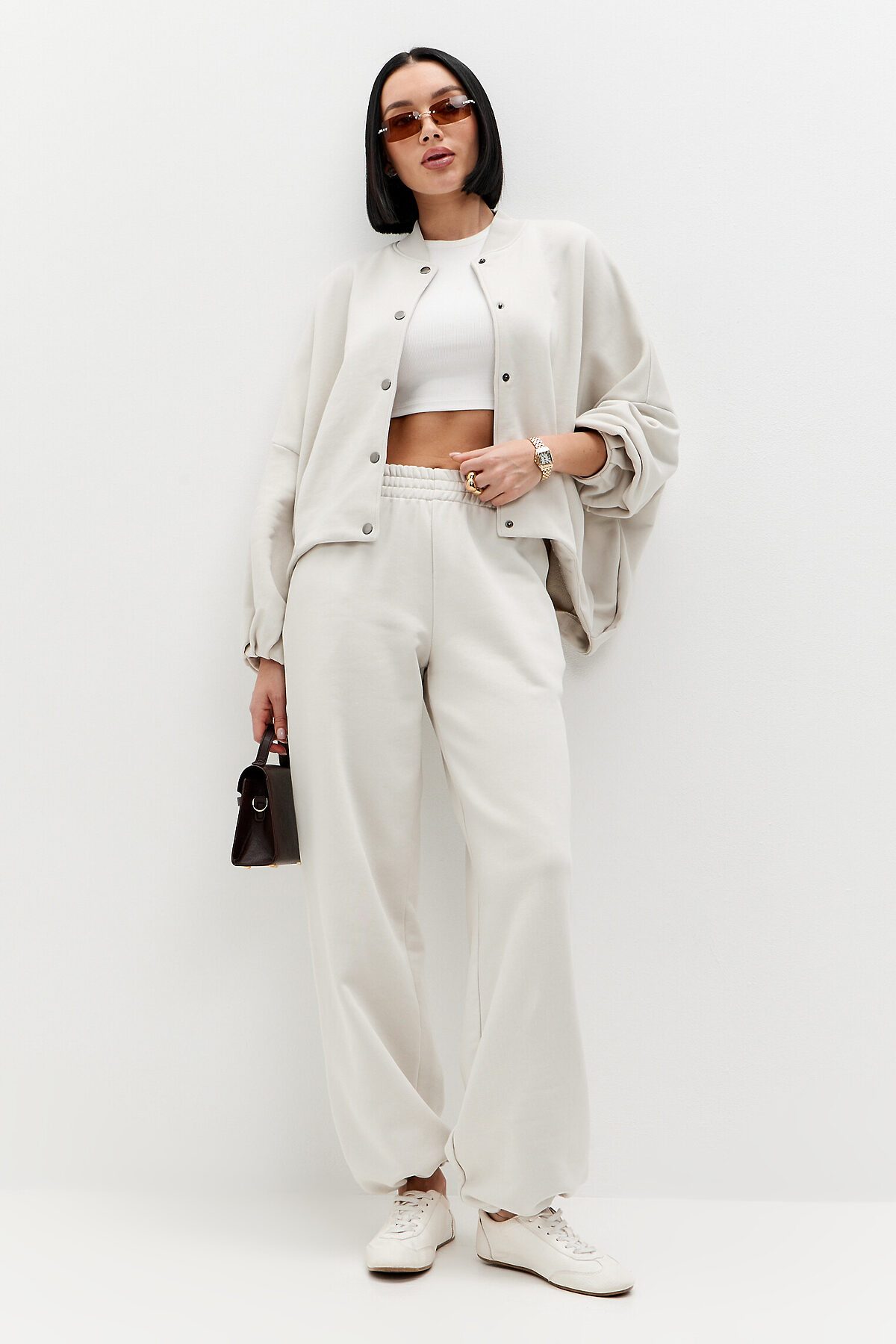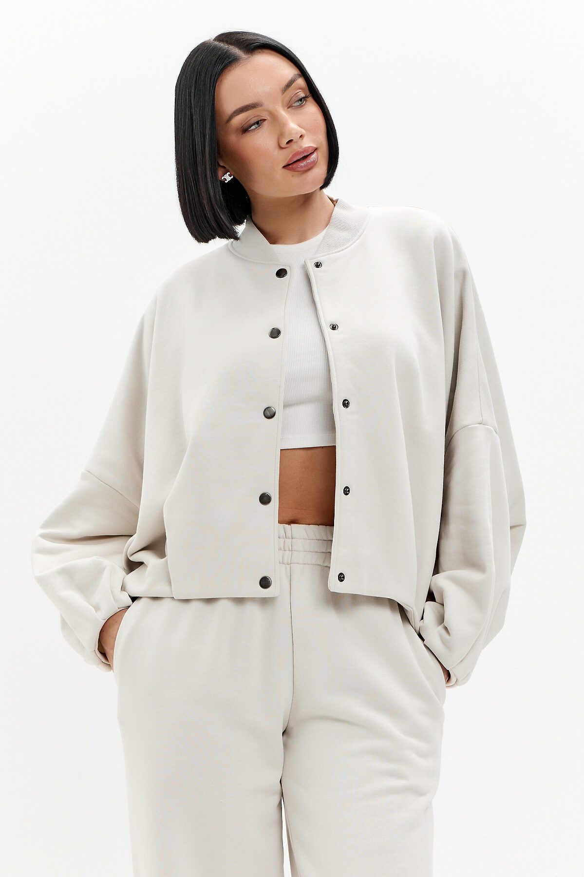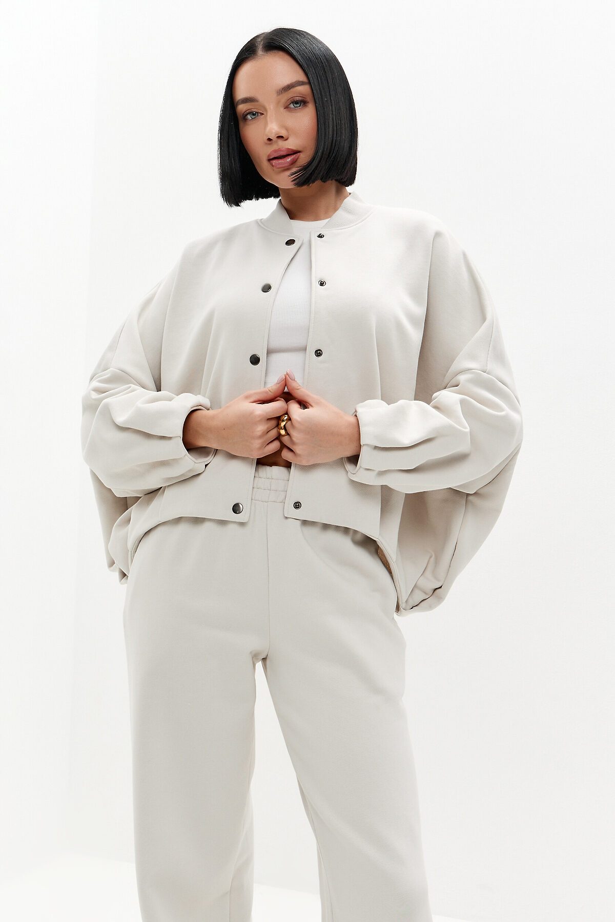 Модель оверсайз, с объемными рукавами силуэта "летучая мышь". Низ изделия и рукавов декорирован трендовой изящной складкой. Бомбер застегивается на кнопки, ворот выполнены из эластичного фактурного материала.