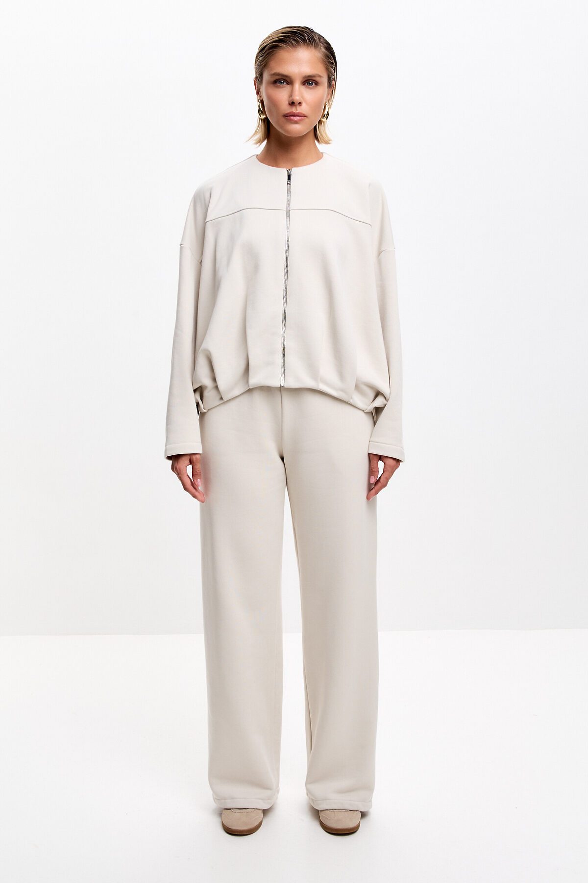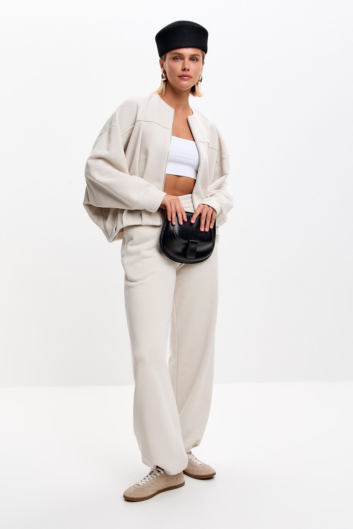 Модель оверсайз, с зауженными к запястью рукавами силуэта "летучая мышь". Низ изделия декорирован трендовой изящной складкой. Жакет с круглым вырезом горловины, застегивается на разъемную молнию.