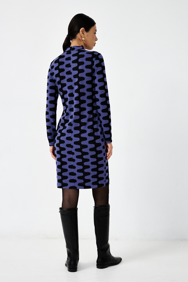 Платье полуприлегающего силуэта из эластичного полотна с жаккардовым узором. Вырез горловины оформлен воротником-стойкой. Втачной длинный рукав.