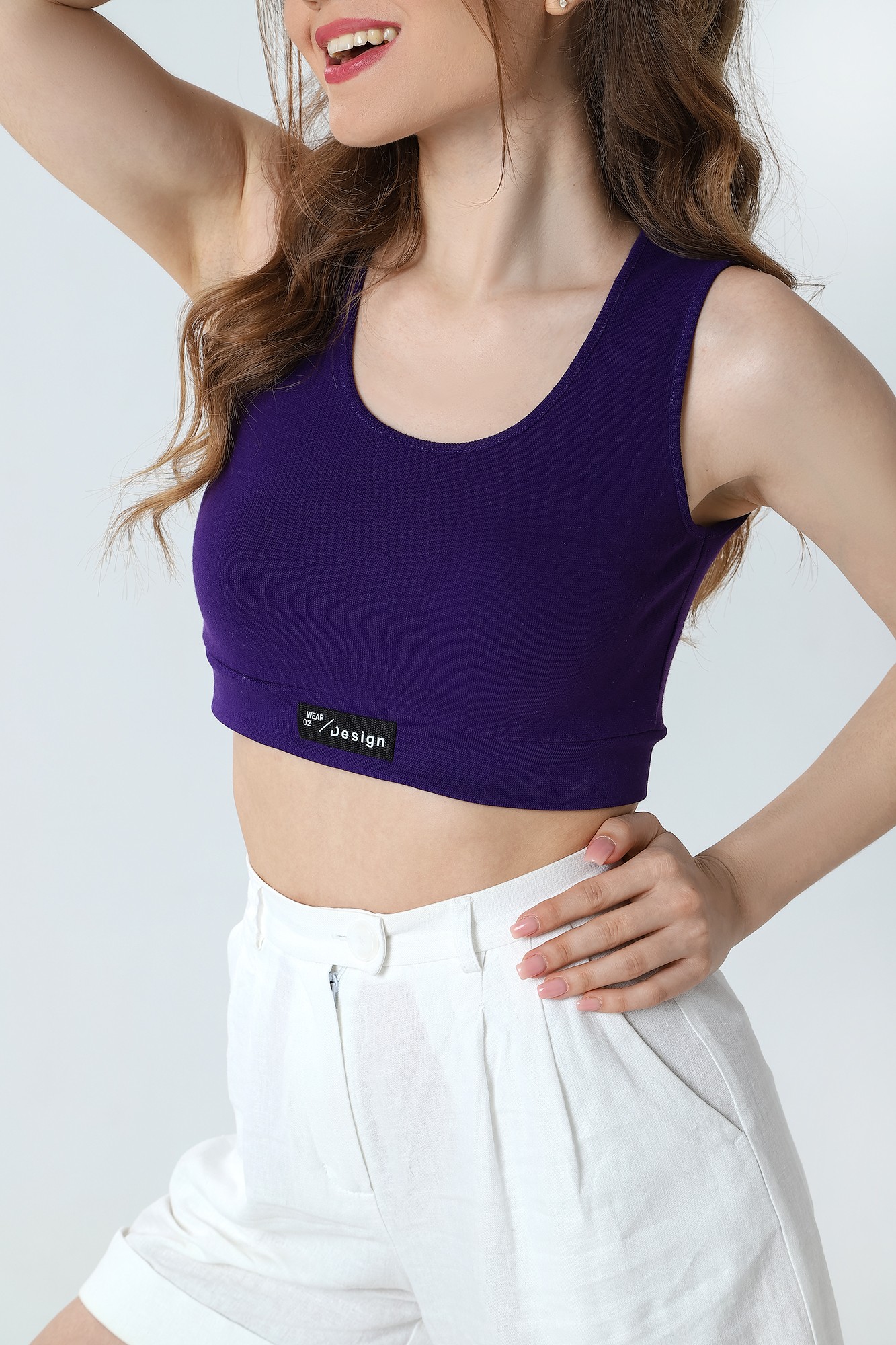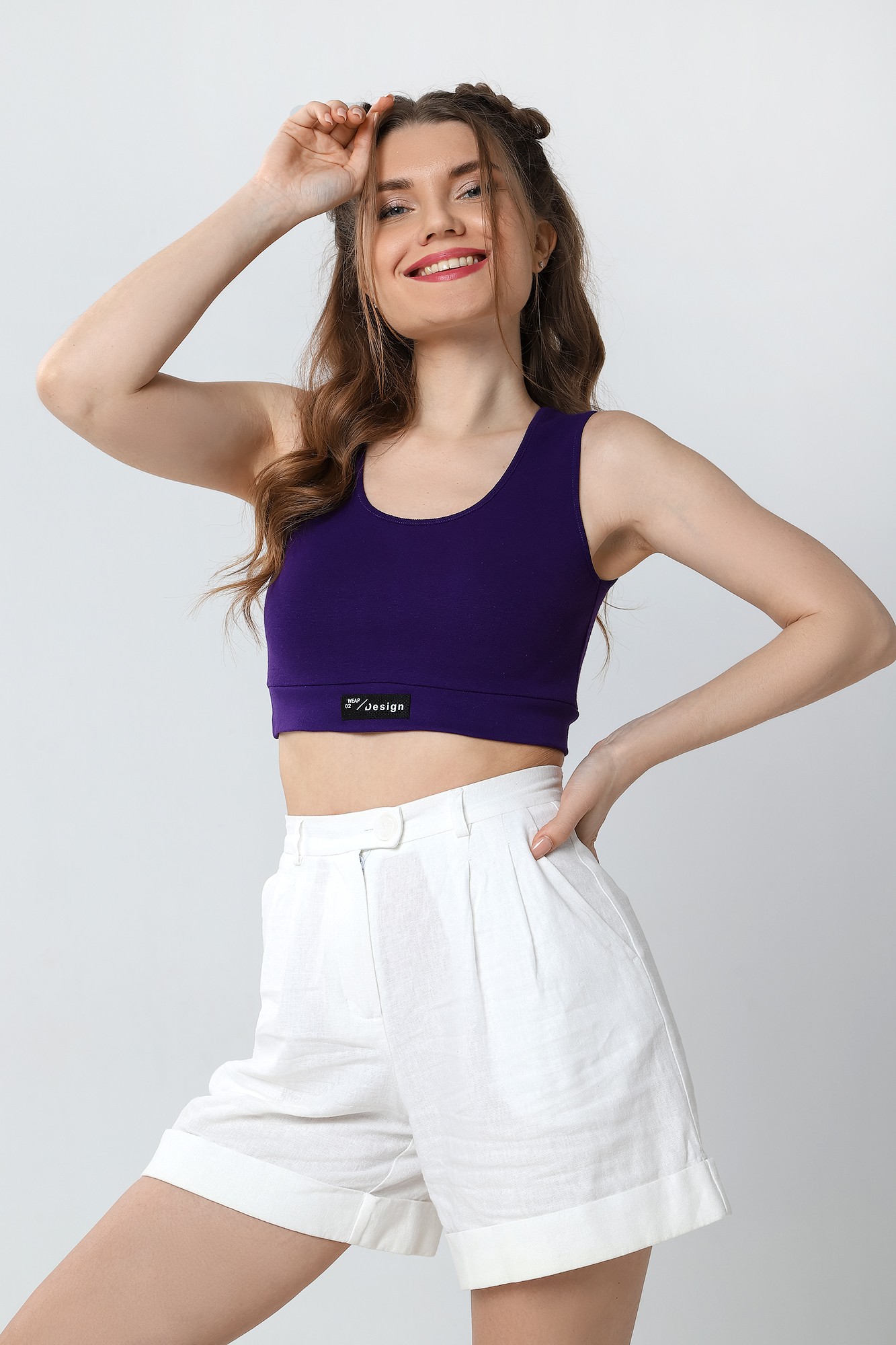 Кроп-топ – из полотна «рибана» без рукавов, с горловиной овальной формы, обработанной окантовкой из основного материала и притачным поясом по низу. В центре пояса настрочен декоративный элемент.